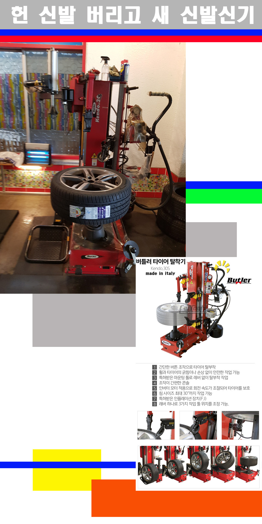 이태리 버틀러사의 켄도3.0S는 휠과 타이어와 조립과 분리시 전혀 제품에 손상을 주지않는 탈착기로 특히 센터락방식(중앙에서 휠를 고정하는 방식)이여서 휠의 중앙부위 잡아서 타이어를 탈부착하고 이후 상하롤러로 타이어를 탈부착합니다 특히 유니포미티작업(휠의 가장가벼운부분과 타이어의 가장 무거운부분을 매칭시키는 작업)시 작업자가 타이어를 정확한 지점에 휠과 매칭시킬수 있는 장점도 있습니다 유니포미티작업 불량시 과도한 진동값으로 핸들링불안 승차감저하 과도한 노면의 충격흡수를 가져와 주행감성을 해치는 첫번째 이유입니다 하지만 이런 작업을 무시하고 그냥 정적인 휠발란스작업만 하는것이 현실입니다 보통 타이어가격만 생각하시고 장착을 하시는데 꼭 이런 부분까지 챙길수 있는 샵을 권장합니다