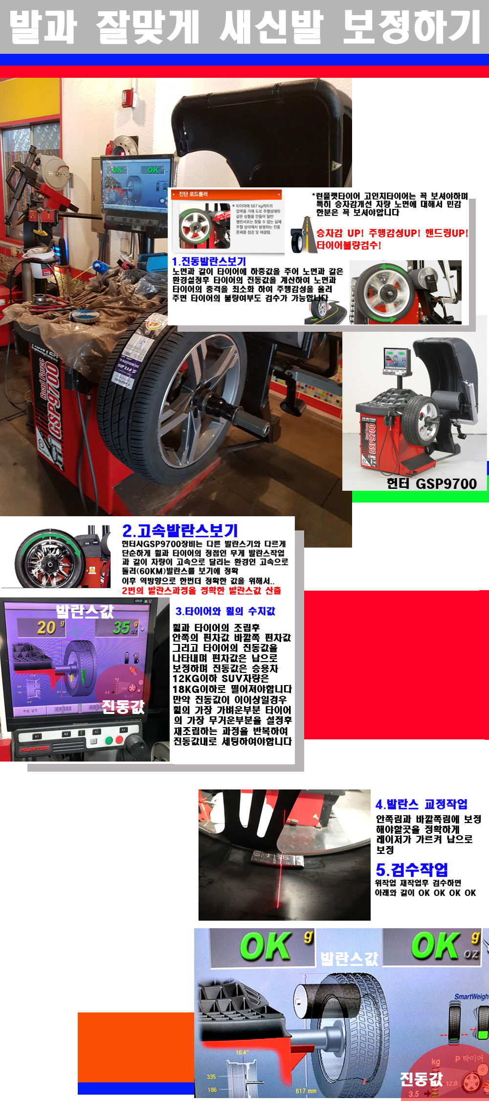 이후 미국 헌터사 GSP9700장비로 고속 및 진동발란스로 더욱더 작업의 정확도와 정밀도를 높였습니다 이장비는 노면에서 올라오는 진동값까지 계산하여 발란스값을 보는 방식으로 진동발란스기는 헌터사GSP9700장비가 유일합니다 이후 역방향으로 60키로의 고속으로 다시 발란스값을 보정하는 방식입니다 그래서 노면에서 올라오는 진동를 잡을수 있으며 특히 타이어의 노면력 측정으로 타이어의 불량여부까지도 검수가 가능한 장비입니다 특히 고속발란스 측정시 타사 발란스기와 틀리게 고속으로 발란스를 보기에 차량이 고속으로 달리는 시뮤레이션 구현이 가능하여 정확한 발란스값을 볼수가 있습니다 그리고 작업자에게는 불필요한 발란스납을 붙이지 않아 미관상으로 좋고 납을 절약하는 고객님에게도윈이고 작업자에게도 윈윈할수 있는 장비입니다 그리고 시중에서 고속진동발란스라고 말하시는 샵들이 많은데 꼭아셔야하는것은 고속발란스는 말그대로 발란스를 볼때 고속으로 돌리기에 60키로 전후 그리고 진동값을 계산하기위해서는 발란스기에 진동롤러가 있어야합니다 그래서 미국헌터사 GSP9700장비가 유일합니다