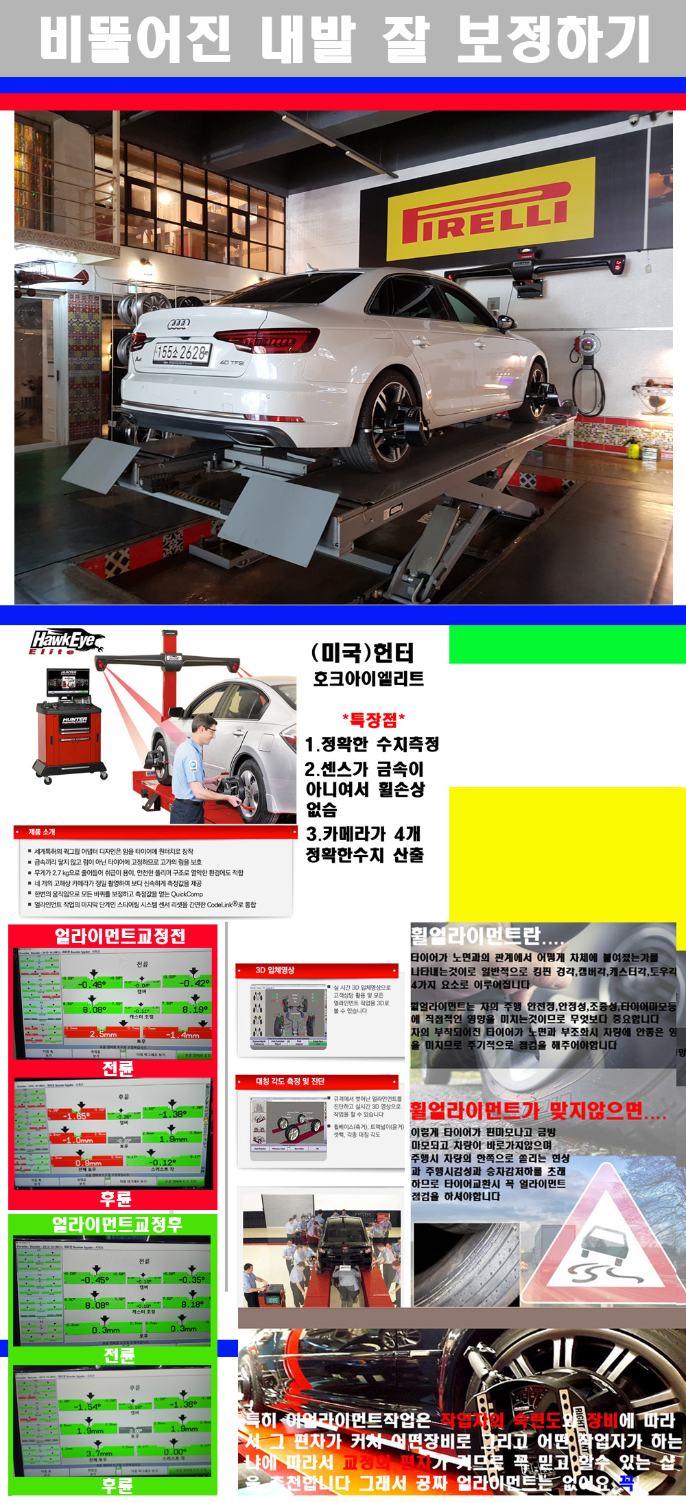 이후 미국 헌터사 호크아이엘리트 장비로 3D얼라이먼트를 진행했습니다 이장비는 현존하는 가장 진화된 얼라이먼트장비입니다 특히 4개의 고성능카메라가 장착되어져 있어 실시간으로 오차가 없는 측정값을 구현하며 바퀴당 각 휠센서 클램프가 프라스틱이며 타이어바닦면을 지지하는 방식이여서 휠의 손상이 없는것이 특징입니다 하지만 장비보다 차량의 얼라이먼트를 볼시 작업자의 정성과 그리고 능력과 숙련도가 관견이기에 꼭 휠얼라이먼트를 장사수단으로 하지않는 샵을 권장합니다 자사는 얼라이먼트정렬시 교정전 교정후를 구분하여 고객님께 직접 이수치값을 확인시켜드리고 작업을 하며 이후 각각의 특성을 가진 타이어들에 대해서 설명 및 관리요령 운전요령 같이 설명해드리고 있습니다 이후 타이어와 휠의 정확한 발란스값과 진동값을 보정후 헌터사 호크아이엘리트 3D얼라이먼트장비로 공장에서 처음 출고될시의 팩토리값으로 교정하였습니다 그리고 타이어질소가스주입기로 3번정도 진공상태로 만든후 질소가스를 주입했습니다 질소가스주입시 가장 관견은 순도이기에 이런 여러번의 진공상태후 주입하고 빼주는 과정를 많이 해주어야합니다 질소가스의 주입시 타이어공기압의 저하가 덜하고 화합물질이 반응을 하지않아 소음전파력과 그리고 타이어안쪽에 수분을 발생하지않으며 타이어안쪽에서의 공기압이 팽창하지않아 타이어에 스트레스를 덜주게 됩니다 하지만 이부분도 공기속에 질소가 80%정도 존재하기에 미미한 차이이지만 질소순도를 높이고 주행시 좋은 점이 확연히 많기에 질소주입을 해드리고 있습니다 특히 고성능타이어나 하중값을 많이 주는 타이어일경우에는 위에서 언급한 부분에서 많이 차이를 보이고 있습니다 이후 타이어왁싱후 출고했습니다+ 감사합니다 |