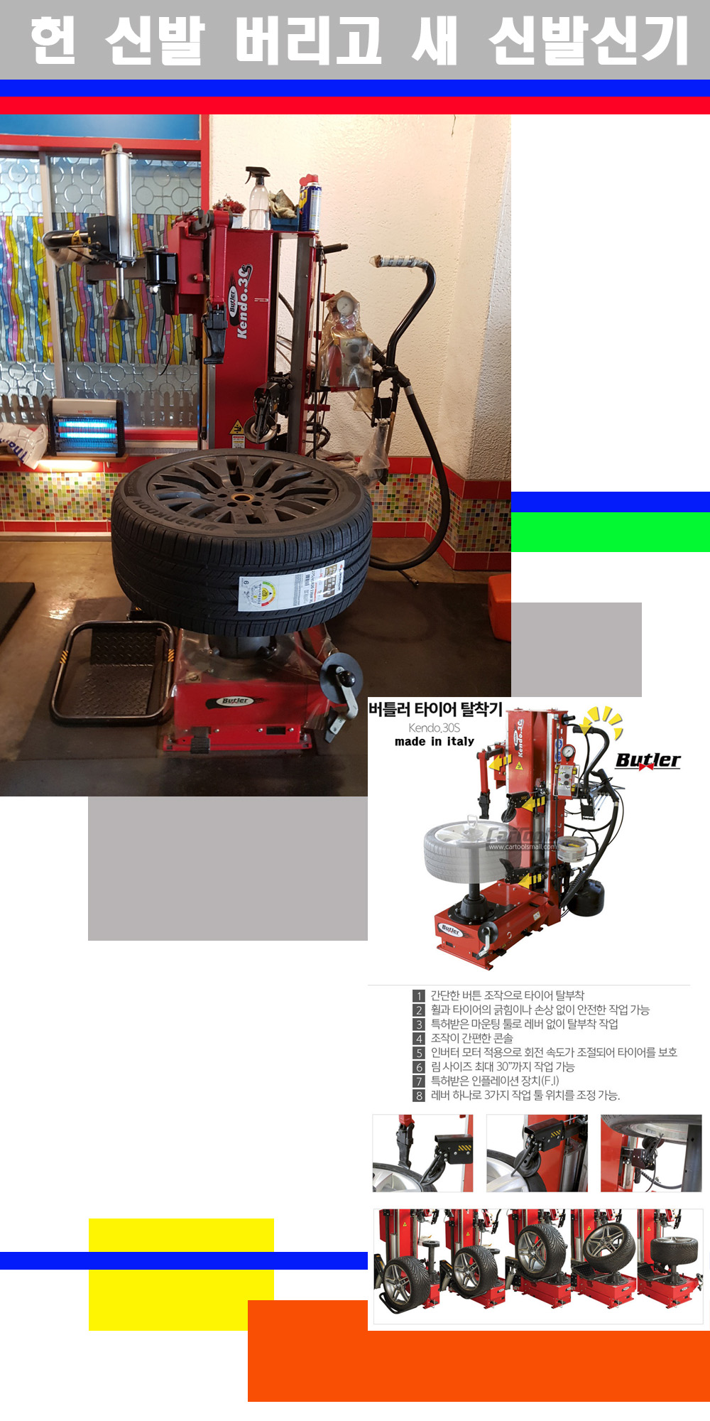 이태리 버틀러사의 켄도3.0S는 휠과 타이어와 조립과 분리시 전혀 제품에 손상을 주지않는 탈착기로 특히 센터락방식(중앙에서 휠를 고정하는 방식)이여서 휠의 중앙부위 잡아서 타이어를 탈부착하고 이후 상하롤러로 타이어를 탈부착합니다 특히 유니포미티작업(휠의 가장가벼운부분과 타이어의 가장 무거운부분을 매칭시키는 작업)시 작업자가 타이어를 정확한 지점에 휠과 매칭시킬수 있는 장점도 있습니다 유니포미티작업 불량시 과도한 진동값으로 핸들링불안 승차감저하 과도한 노면의 충격흡수를 가져와 주행감성을 해치는 첫번째 이유입니다 하지만 이런 작업을 무시하고 그냥 정적인 휠발란스작업만 하는것이 현실입니다 보통 타이어가격만 생각하시고 장착을 하시는데 꼭 이런 부분까지 챙길수 있는 샵을 권장합니다