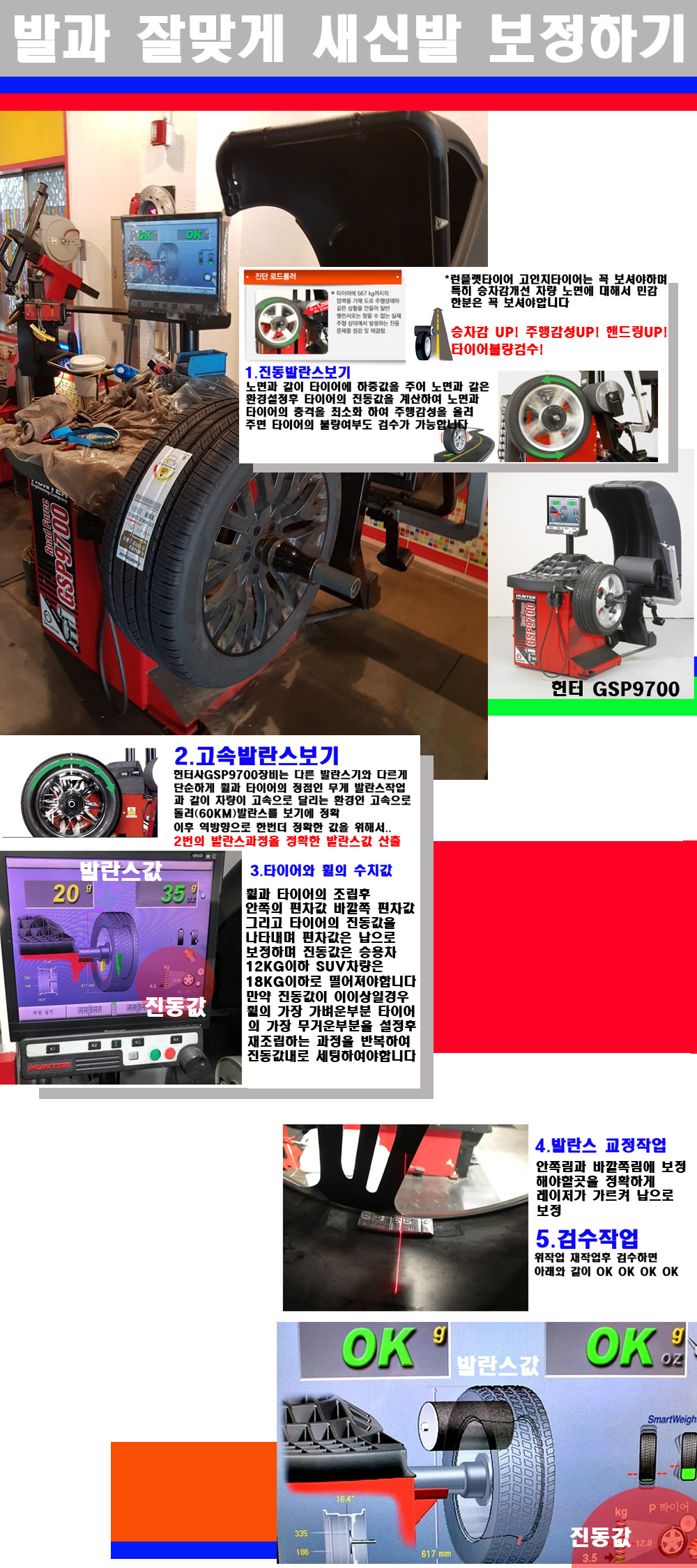 이후 미국 헌터사 GSP9700장비로 고속 및 진동발란스로 더욱더 작업의 정확도와 정밀도를 높였습니다 이장비는 노면에서 올라오는 진동값까지 계산하여 발란스값을 보는 방식으로 진동발란스기는 헌터사GSP9700장비가 유일합니다 이후 역방향으로 60키로의 고속으로 다시 발란스값을 보정하는 방식입니다 그래서 노면에서 올라오는 진동를 잡을수 있으며 특히 타이어의 노면력 측정으로 타이어의 불량여부까지도 검수가 가능한 장비입니다 특히 고속발란스 측정시 타사 발란스기와 틀리게 고속으로 발란스를 보기에 차량이 고속으로 달리는 시뮤레이션 구현이 가능하여 정확한 발란스값을 볼수가 있습니다 그리고 작업자에게는 불필요한 발란스납을 붙이지 않아 미관상으로 좋고 납을 절약하는 고객님에게도윈이고 작업자에게도 윈윈할수 있는 장비입니다 그리고 시중에서 고속진동발란스라고 말하시는 샵들이 많은데 꼭아셔야하는것은 고속발란스는 말그대로 발란스를 볼때 고속으로 돌리기에 60키로 전후 그리고 진동값을 계산하기위해서는 발란스기에 진동롤러가 있어야합니다 그래서 미국헌터사 GSP9700장비가 유일합니다