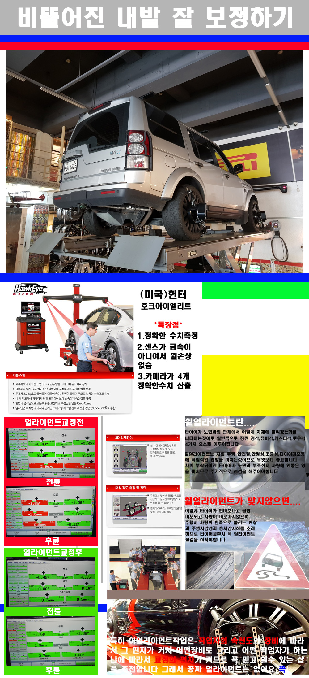 이후 미국 헌터사 호크아이엘리트 장비로 3D얼라이먼트를 진행했습니다 이장비는 현존하는 가장 진화된 얼라이먼트장비입니다 특히 4개의 고성능카메라가 장착되어져 있어 실시간으로 오차가 없는 측정값을 구현하며 바퀴당 각 휠센서 클램프가 프라스틱이며 타이어바닦면을 지지하는 방식이여서 휠의 손상이 없는것이 특징입니다 하지만 장비보다 차량의 얼라이먼트를 볼시 작업자의 정성과 그리고 능력과 숙련도가 관견이기에 꼭 휠얼라이먼트를 장사수단으로 하지않는 샵을 권장합니다 자사는 얼라이먼트정렬시 교정전 교정후를 구분하여 고객님께 직접 이수치값을 확인시켜드리고 작업을 하며 이후 각각의 특성을 가진 타이어들에 대해서 설명 및 관리요령 운전요령 같이 설명해드리고 있습니다 이후 타이어와 휠의 정확한 발란스값과 진동값을 보정후 헌터사 호크아이엘리트 3D얼라이먼트장비로 공장에서 처음 출고될시의 팩토리값으로 교정하였습니다 그리고 타이어질소가스주입기로 3번정도 진공상태로 만든후 질소가스를 주입했습니다 질소가스주입시 가장 관견은 순도이기에 이런 여러번의 진공상태후 주입하고 빼주는 과정를 많이 해주어야합니다 질소가스의 주입시 타이어공기압의 저하가 덜하고 화합물질이 반응을 하지않아 소음전파력과 그리고 타이어안쪽에 수분을 발생하지않으며 타이어안쪽에서의 공기압이 팽창하지않아 타이어에 스트레스를 덜주게 됩니다 하지만 이부분도 공기속에 질소가 80%정도 존재하기에 미미한 차이이지만 질소순도를 높이고 주행시 좋은 점이 확연히 많기에 질소주입을 해드리고 있습니다 특히 고성능타이어나 하중값을 많이 주는 타이어일경우에는 위에서 언급한 부분에서 많이 차이를 보이고 있습니다 이후 타이어왁싱후 출고했습니다+ 감사합니다 |