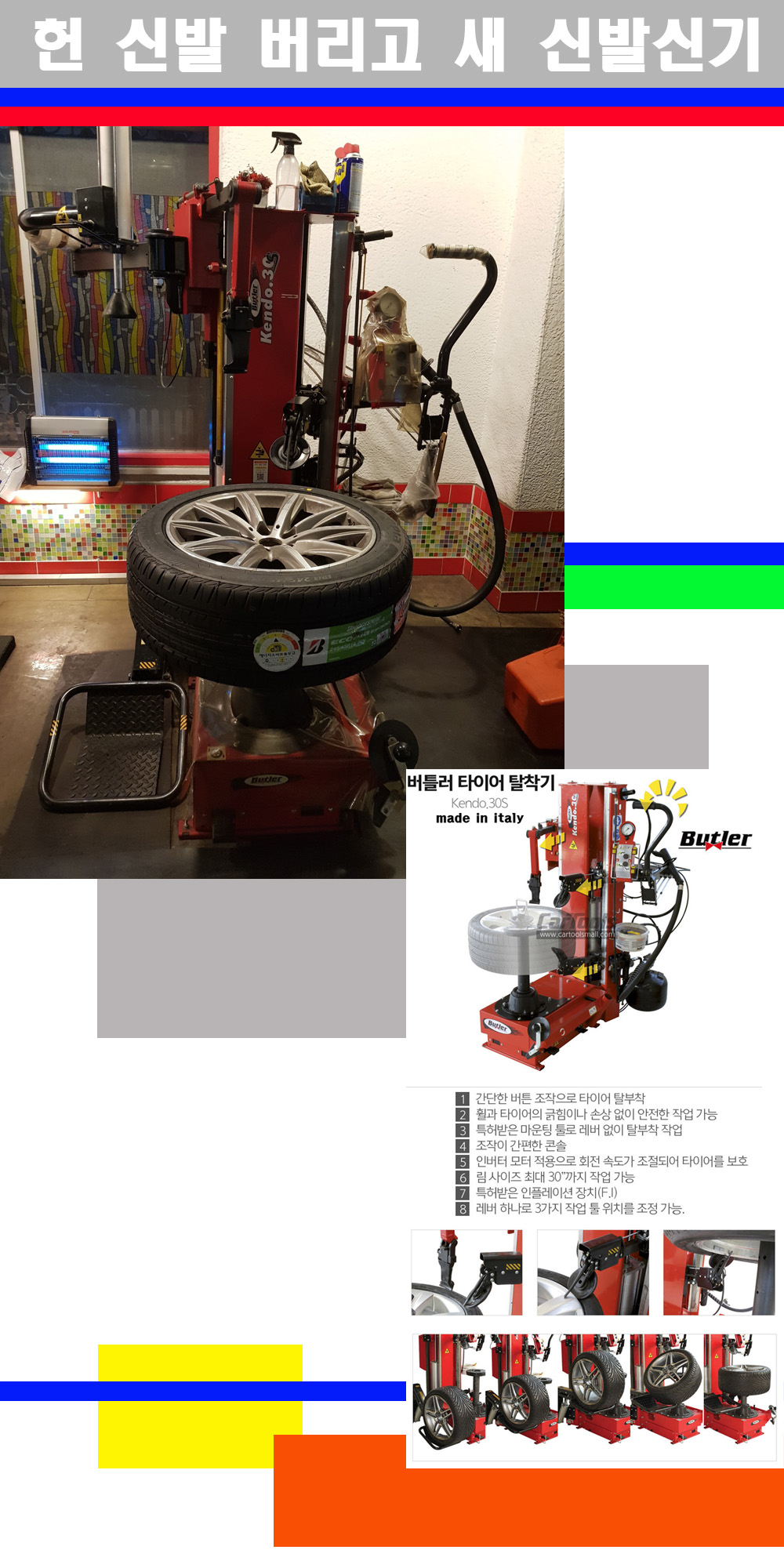 이태리 버틀러사의 켄도3.0S는 휠과 타이어와 조립과 분리시 전혀 제품에 손상을 주지않는 탈착기로 특히 센터락방식(중앙에서 휠를 고정하는 방식)이여서 휠의 중앙부위 잡아서 타이어를 탈부착하고 이후 상하롤러로 타이어를 탈부착합니다 특히 유니포미티작업(휠의 가장가벼운부분과 타이어의 가장 무거운부분을 매칭시키는 작업)시 작업자가 타이어를 정확한 지점에 휠과 매칭시킬수 있는 장점도 있습니다 유니포미티작업 불량시 과도한 진동값으로 핸들링불안 승차감저하 과도한 노면의 충격흡수를 가져와 주행감성을 해치는 첫번째 이유입니다 하지만 이런 작업을 무시하고 그냥 정적인 휠발란스작업만 하는것이 현실입니다 보통 타이어가격만 생각하시고 장착을 하시는데 꼭 이런 부분까지 챙길수 있는 샵을 권장합니다