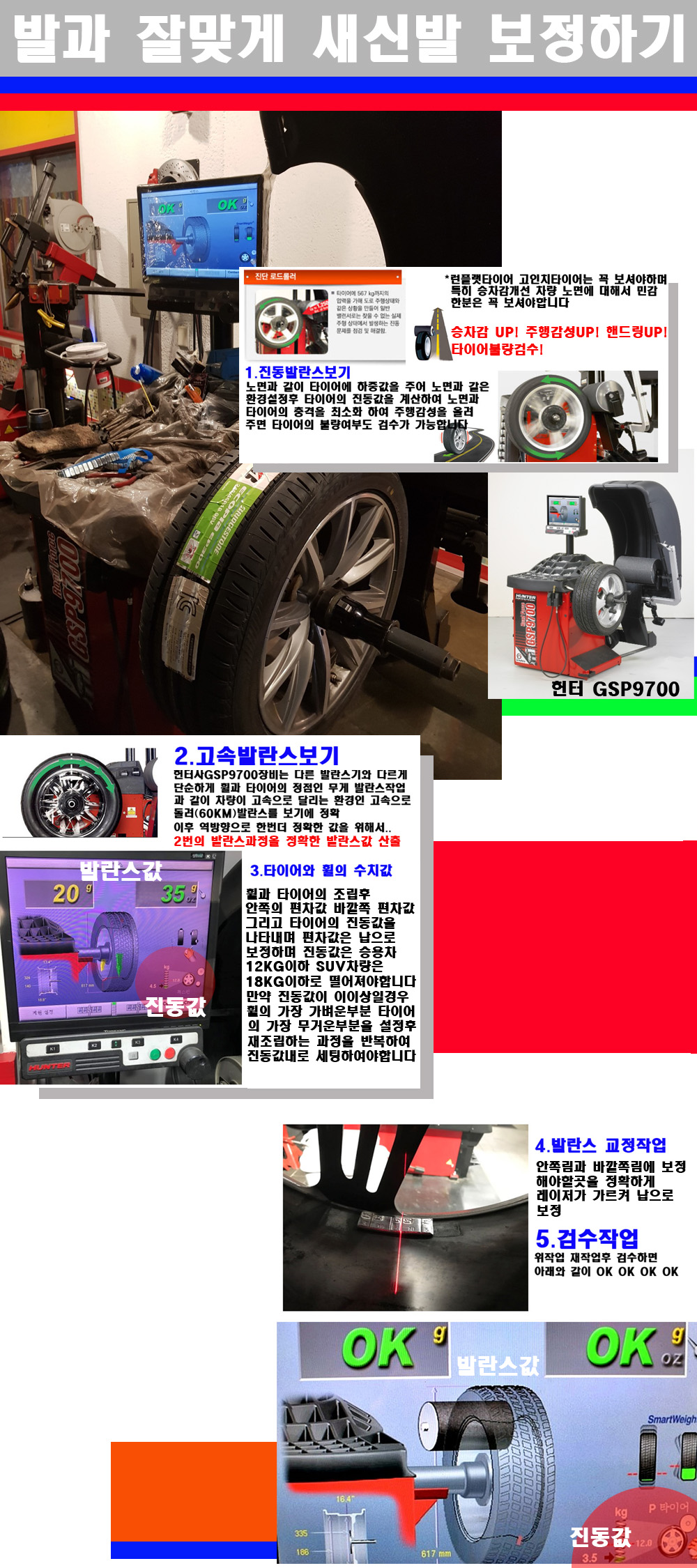 이후 미국 헌터사 GSP9700장비로 고속 및 진동발란스로 더욱더 작업의 정확도와 정밀도를 높였습니다 이장비는 노면에서 올라오는 진동값까지 계산하여 발란스값을 보는 방식으로 진동발란스기는 헌터사GSP9700장비가 유일합니다 이후 역방향으로 60키로의 고속으로 다시 발란스값을 보정하는 방식입니다 그래서 노면에서 올라오는 진동를 잡을수 있으며 특히 타이어의 노면력 측정으로 타이어의 불량여부까지도 검수가 가능한 장비입니다 특히 고속발란스 측정시 타사 발란스기와 틀리게 고속으로 발란스를 보기에 차량이 고속으로 달리는 시뮤레이션 구현이 가능하여 정확한 발란스값을 볼수가 있습니다 그리고 작업자에게는 불필요한 발란스납을 붙이지 않아 미관상으로 좋고 납을 절약하는 고객님에게도윈이고 작업자에게도 윈윈할수 있는 장비입니다 그리고 시중에서 고속진동발란스라고 말하시는 샵들이 많은데 꼭아셔야하는것은 고속발란스는 말그대로 발란스를 볼때 고속으로 돌리기에 60키로 전후 그리고 진동값을 계산하기위해서는 발란스기에 진동롤러가 있어야합니다 그래서 미국헌터사 GSP9700장비가 유일합니다