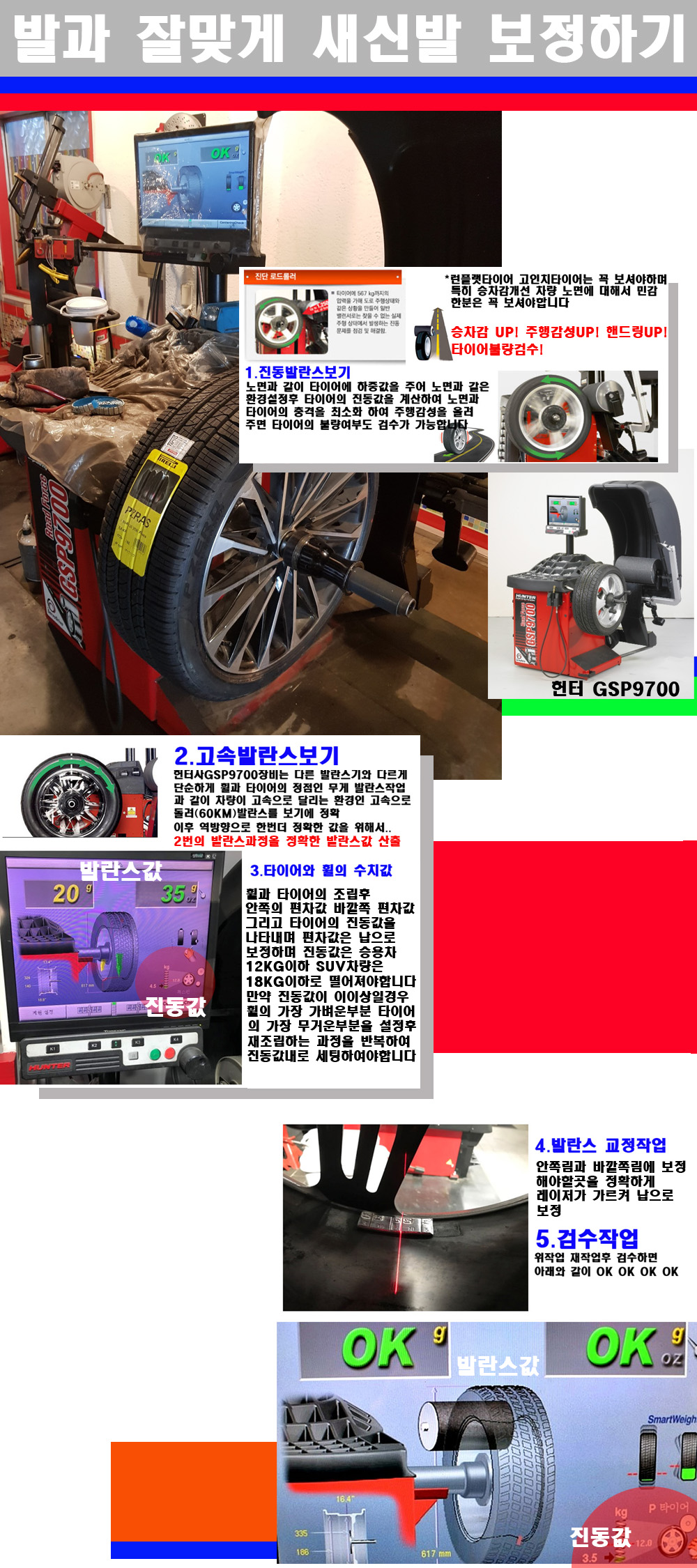 이후 미국 헌터사 GSP9700장비로 고속 및 진동발란스로 더욱더 작업의 정확도와 정밀도를 높였습니다 이장비는 노면에서 올라오는 진동값까지 계산하여 발란스값을 보는 방식으로 진동발란스기는 헌터사GSP9700장비가 유일합니다 이후 역방향으로 60키로의 고속으로 다시 발란스값을 보정하는 방식입니다 그래서 노면에서 올라오는 진동를 잡을수 있으며 특히 타이어의 노면력 측정으로 타이어의 불량여부까지도 검수가 가능한 장비입니다 특히 고속발란스 측정시 타사 발란스기와 틀리게 고속으로 발란스를 보기에 차량이 고속으로 달리는 시뮤레이션 구현이 가능하여 정확한 발란스값을 볼수가 있습니다 그리고 작업자에게는 불필요한 발란스납을 붙이지 않아 미관상으로 좋고 납을 절약하는 고객님에게도윈이고 작업자에게도 윈윈할수 있는 장비입니다 그리고 시중에서 고속진동발란스라고 말하시는 샵들이 많은데 꼭아셔야하는것은 고속발란스는 말그대로 발란스를 볼때 고속으로 돌리기에 60키로 전후 그리고 진동값을 계산하기위해서는 발란스기에 진동롤러가 있어야합니다 그래서 미국헌터사 GSP9700장비가 유일합니다