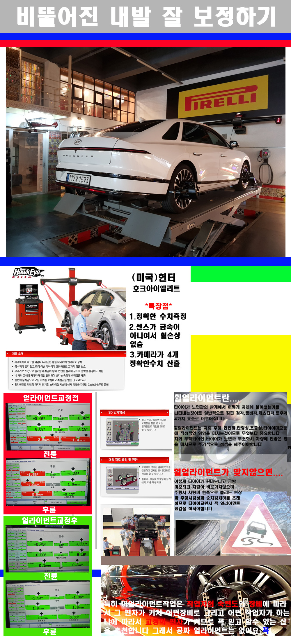 이후 미국 헌터사 호크아이엘리트 장비로 3D얼라이먼트를 진행했습니다 이장비는 현존하는 가장 진화된 얼라이먼트장비입니다 특히 4개의 고성능카메라가 장착되어져 있어 실시간으로 오차가 없는 측정값을 구현하며 바퀴당 각 휠센서 클램프가 프라스틱이며 타이어바닦면을 지지하는 방식이여서 휠의 손상이 없는것이 특징입니다 하지만 장비보다 차량의 얼라이먼트를 볼시 작업자의 정성과 그리고 능력과 숙련도가 관견이기에 꼭 휠얼라이먼트를 장사수단으로 하지않는 샵을 권장합니다 자사는 얼라이먼트정렬시 교정전 교정후를 구분하여 고객님께 직접 이수치값을 확인시켜드리고 작업을 하며 이후 각각의 특성을 가진 타이어들에 대해서 설명 및 관리요령 운전요령 같이 설명해드리고 있습니다 이후 타이어와 휠의 정확한 발란스값과 진동값을 보정후 헌터사 호크아이엘리트 3D얼라이먼트장비로 공장에서 처음 출고될시의 팩토리값으로 교정하였습니다 그리고 타이어질소가스주입기로 3번정도 진공상태로 만든후 질소가스를 주입했습니다 질소가스주입시 가장 관견은 순도이기에 이런 여러번의 진공상태후 주입하고 빼주는 과정를 많이 해주어야합니다 질소가스의 주입시 타이어공기압의 저하가 덜하고 화합물질이 반응을 하지않아 소음전파력과 그리고 타이어안쪽에 수분을 발생하지않으며 타이어안쪽에서의 공기압이 팽창하지않아 타이어에 스트레스를 덜주게 됩니다 하지만 이부분도 공기속에 질소가 80%정도 존재하기에 미미한 차이이지만 질소순도를 높이고 주행시 좋은 점이 확연히 많기에 질소주입을 해드리고 있습니다 특히 고성능타이어나 하중값을 많이 주는 타이어일경우에는 위에서 언급한 부분에서 많이 차이를 보이고 있습니다 이후 타이어왁싱후 출고했습니다+ 감사합니다 |