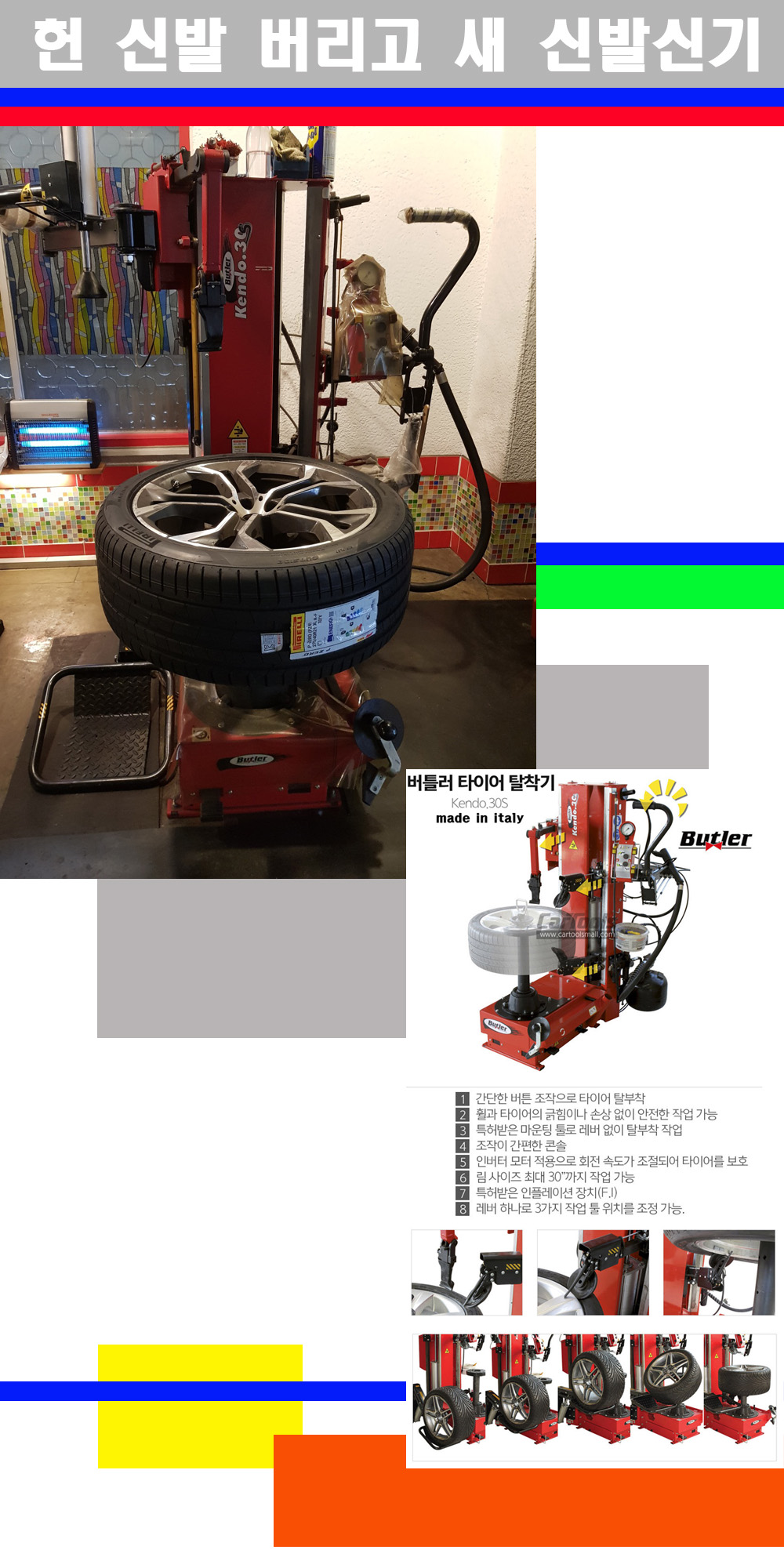 이태리 버틀러사의 켄도3.0S는 휠과 타이어와 조립과 분리시 전혀 제품에 손상을 주지않는 탈착기로 특히 센터락방식(중앙에서 휠를 고정하는 방식)이여서 휠의 중앙부위 잡아서 타이어를 탈부착하고 이후 상하롤러로 타이어를 탈부착합니다 특히 유니포미티작업(휠의 가장가벼운부분과 타이어의 가장 무거운부분을 매칭시키는 작업)시 작업자가 타이어를 정확한 지점에 휠과 매칭시킬수 있는 장점도 있습니다 유니포미티작업 불량시 과도한 진동값으로 핸들링불안 승차감저하 과도한 노면의 충격흡수를 가져와 주행감성을 해치는 첫번째 이유입니다 하지만 이런 작업을 무시하고 그냥 정적인 휠발란스작업만 하는것이 현실입니다 보통 타이어가격만 생각하시고 장착을 하시는데 꼭 이런 부분까지 챙길수 있는 샵을 권장합니다