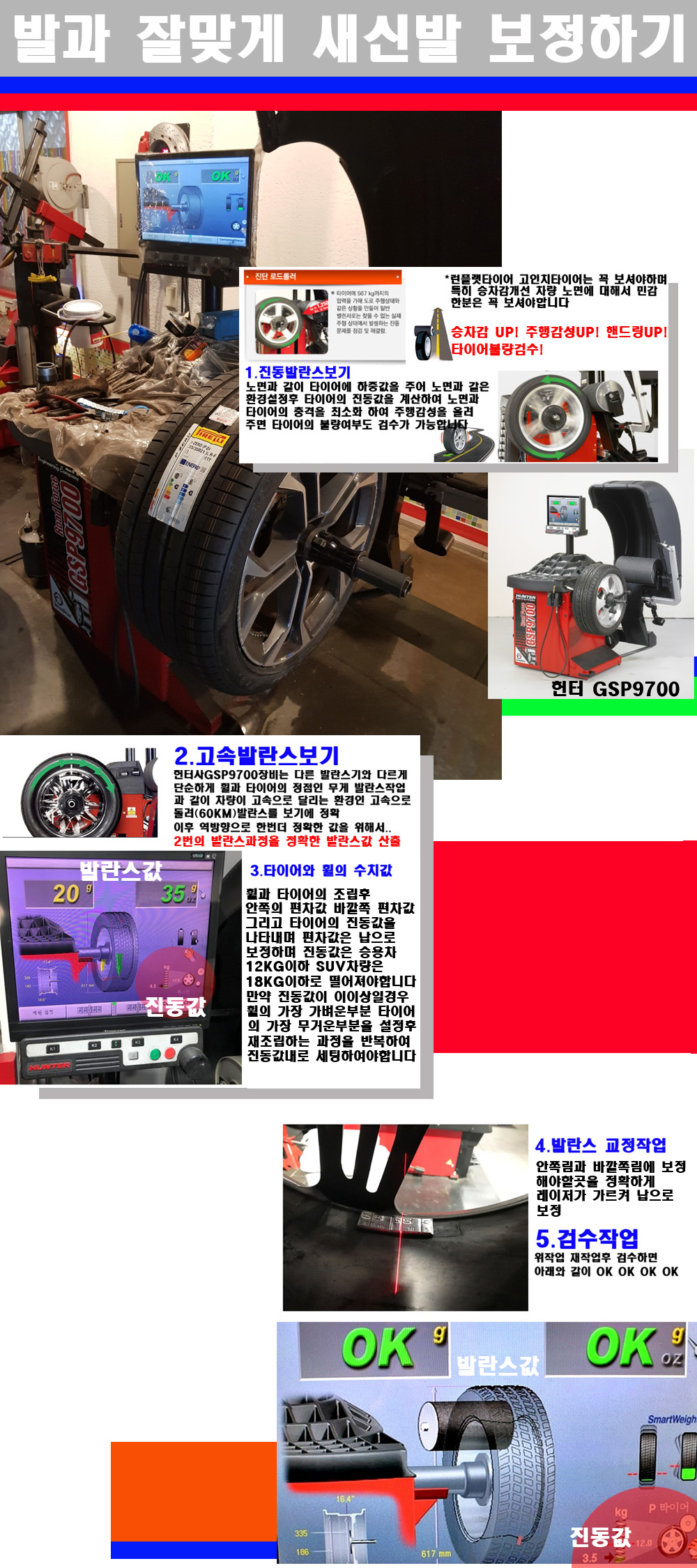 이후 미국 헌터사 GSP9700장비로 고속 및 진동발란스로 더욱더 작업의 정확도와 정밀도를 높였습니다 이장비는 노면에서 올라오는 진동값까지 계산하여 발란스값을 보는 방식으로 진동발란스기는 헌터사GSP9700장비가 유일합니다 이후 역방향으로 60키로의 고속으로 다시 발란스값을 보정하는 방식입니다 그래서 노면에서 올라오는 진동를 잡을수 있으며 특히 타이어의 노면력 측정으로 타이어의 불량여부까지도 검수가 가능한 장비입니다 특히 고속발란스 측정시 타사 발란스기와 틀리게 고속으로 발란스를 보기에 차량이 고속으로 달리는 시뮤레이션 구현이 가능하여 정확한 발란스값을 볼수가 있습니다 그리고 작업자에게는 불필요한 발란스납을 붙이지 않아 미관상으로 좋고 납을 절약하는 고객님에게도윈이고 작업자에게도 윈윈할수 있는 장비입니다 그리고 시중에서 고속진동발란스라고 말하시는 샵들이 많은데 꼭아셔야하는것은 고속발란스는 말그대로 발란스를 볼때 고속으로 돌리기에 60키로 전후 그리고 진동값을 계산하기위해서는 발란스기에 진동롤러가 있어야합니다 그래서 미국헌터사 GSP9700장비가 유일합니다