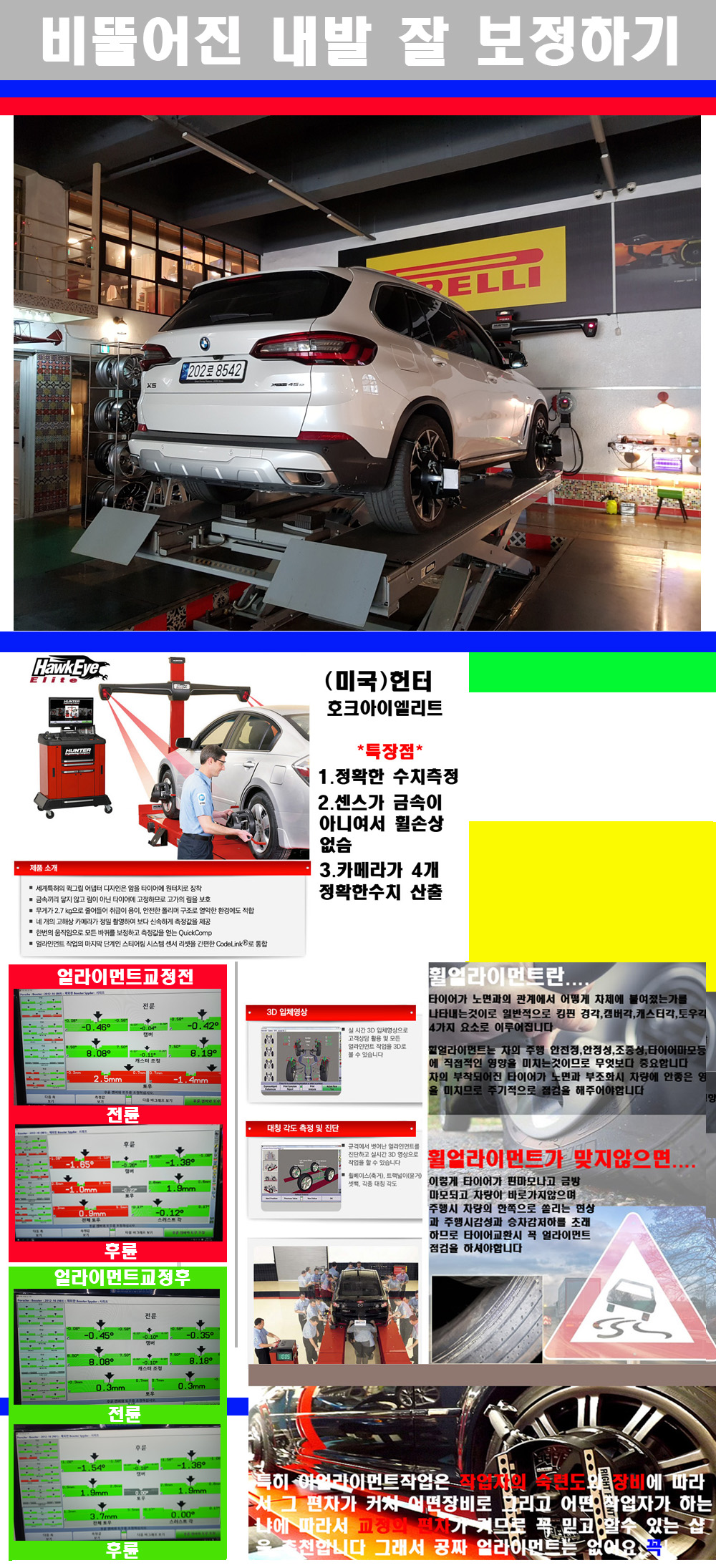 이후 미국 헌터사 호크아이엘리트 장비로 3D얼라이먼트를 진행했습니다 이장비는 현존하는 가장 진화된 얼라이먼트장비입니다 특히 4개의 고성능카메라가 장착되어져 있어 실시간으로 오차가 없는 측정값을 구현하며 바퀴당 각 휠센서 클램프가 프라스틱이며 타이어바닦면을 지지하는 방식이여서 휠의 손상이 없는것이 특징입니다 하지만 장비보다 차량의 얼라이먼트를 볼시 작업자의 정성과 그리고 능력과 숙련도가 관견이기에 꼭 휠얼라이먼트를 장사수단으로 하지않는 샵을 권장합니다 자사는 얼라이먼트정렬시 교정전 교정후를 구분하여 고객님께 직접 이수치값을 확인시켜드리고 작업을 하며 이후 각각의 특성을 가진 타이어들에 대해서 설명 및 관리요령 운전요령 같이 설명해드리고 있습니다 이후 타이어와 휠의 정확한 발란스값과 진동값을 보정후 헌터사 호크아이엘리트 3D얼라이먼트장비로 공장에서 처음 출고될시의 팩토리값으로 교정하였습니다 그리고 타이어질소가스주입기로 3번정도 진공상태로 만든후 질소가스를 주입했습니다 질소가스주입시 가장 관견은 순도이기에 이런 여러번의 진공상태후 주입하고 빼주는 과정를 많이 해주어야합니다 질소가스의 주입시 타이어공기압의 저하가 덜하고 화합물질이 반응을 하지않아 소음전파력과 그리고 타이어안쪽에 수분을 발생하지않으며 타이어안쪽에서의 공기압이 팽창하지않아 타이어에 스트레스를 덜주게 됩니다 하지만 이부분도 공기속에 질소가 80%정도 존재하기에 미미한 차이이지만 질소순도를 높이고 주행시 좋은 점이 확연히 많기에 질소주입을 해드리고 있습니다 특히 고성능타이어나 하중값을 많이 주는 타이어일경우에는 위에서 언급한 부분에서 많이 차이를 보이고 있습니다 이후 타이어왁싱후 출고했습니다+ 감사합니다 |
