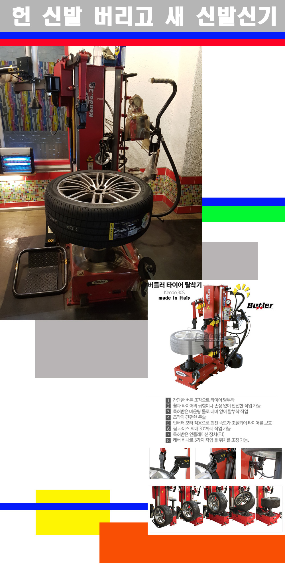 이태리 버틀러사의 켄도3.0S는 휠과 타이어와 조립과 분리시 전혀 제품에 손상을 주지않는 탈착기로 특히 센터락방식(중앙에서 휠를 고정하는 방식)이여서 휠의 중앙부위 잡아서 타이어를 탈부착하고 이후 상하롤러로 타이어를 탈부착합니다 특히 유니포미티작업(휠의 가장가벼운부분과 타이어의 가장 무거운부분을 매칭시키는 작업)시 작업자가 타이어를 정확한 지점에 휠과 매칭시킬수 있는 장점도 있습니다 유니포미티작업 불량시 과도한 진동값으로 핸들링불안 승차감저하 과도한 노면의 충격흡수를 가져와 주행감성을 해치는 첫번째 이유입니다 하지만 이런 작업을 무시하고 그냥 정적인 휠발란스작업만 하는것이 현실입니다 보통 타이어가격만 생각하시고 장착을 하시는데 꼭 이런 부분까지 챙길수 있는 샵을 권장합니다