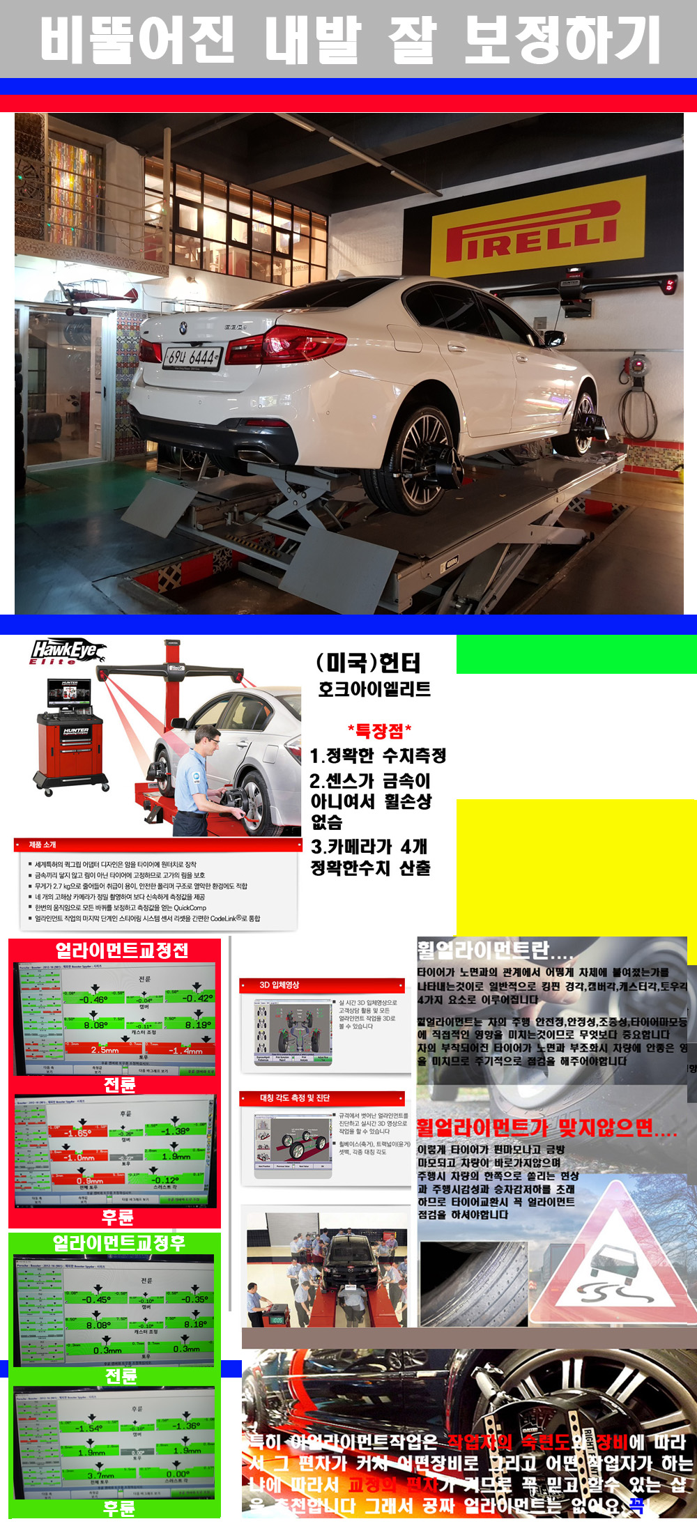 이후 미국 헌터사 호크아이엘리트 장비로 3D얼라이먼트를 진행했습니다 이장비는 현존하는 가장 진화된 얼라이먼트장비입니다 특히 4개의 고성능카메라가 장착되어져 있어 실시간으로 오차가 없는 측정값을 구현하며 바퀴당 각 휠센서 클램프가 프라스틱이며 타이어바닦면을 지지하는 방식이여서 휠의 손상이 없는것이 특징입니다 하지만 장비보다 차량의 얼라이먼트를 볼시 작업자의 정성과 그리고 능력과 숙련도가 관견이기에 꼭 휠얼라이먼트를 장사수단으로 하지않는 샵을 권장합니다 자사는 얼라이먼트정렬시 교정전 교정후를 구분하여 고객님께 직접 이수치값을 확인시켜드리고 작업을 하며 이후 각각의 특성을 가진 타이어들에 대해서 설명 및 관리요령 운전요령 같이 설명해드리고 있습니다 이후 타이어와 휠의 정확한 발란스값과 진동값을 보정후 헌터사 호크아이엘리트 3D얼라이먼트장비로 공장에서 처음 출고될시의 팩토리값으로 교정하였습니다 그리고 타이어질소가스주입기로 3번정도 진공상태로 만든후 질소가스를 주입했습니다 질소가스주입시 가장 관견은 순도이기에 이런 여러번의 진공상태후 주입하고 빼주는 과정를 많이 해주어야합니다 질소가스의 주입시 타이어공기압의 저하가 덜하고 화합물질이 반응을 하지않아 소음전파력과 그리고 타이어안쪽에 수분을 발생하지않으며 타이어안쪽에서의 공기압이 팽창하지않아 타이어에 스트레스를 덜주게 됩니다 하지만 이부분도 공기속에 질소가 80%정도 존재하기에 미미한 차이이지만 질소순도를 높이고 주행시 좋은 점이 확연히 많기에 질소주입을 해드리고 있습니다 특히 고성능타이어나 하중값을 많이 주는 타이어일경우에는 위에서 언급한 부분에서 많이 차이를 보이고 있습니다 이후 타이어왁싱후 출고했습니다+ 감사합니다 |