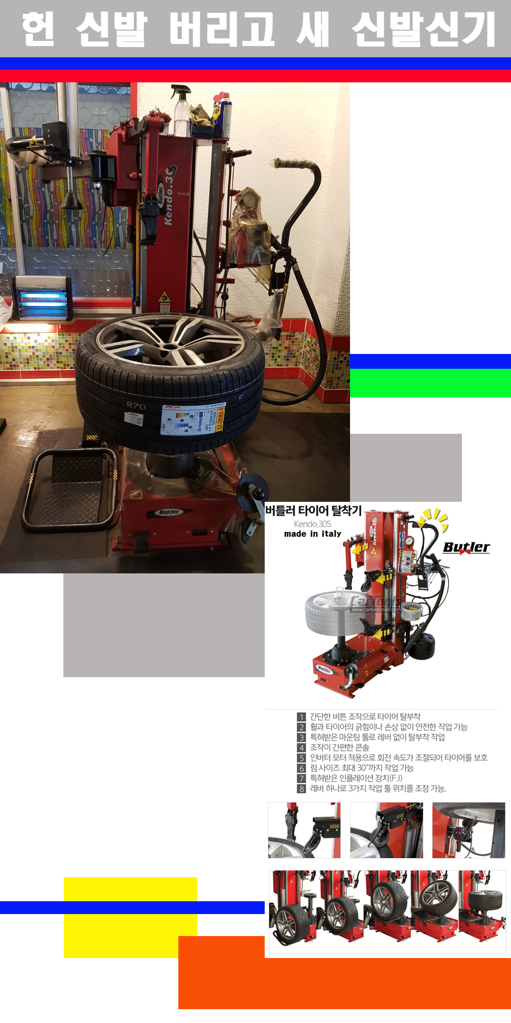 이태리 버틀러사의 켄도3.0S는 휠과 타이어와 조립과 분리시 전혀 제품에 손상을 주지않는 탈착기로 특히 센터락방식(중앙에서 휠를 고정하는 방식)이여서 휠의 중앙부위 잡아서 타이어를 탈부착하고 이후 상하롤러로 타이어를 탈부착합니다 특히 유니포미티작업(휠의 가장가벼운부분과 타이어의 가장 무거운부분을 매칭시키는 작업)시 작업자가 타이어를 정확한 지점에 휠과 매칭시킬수 있는 장점도 있습니다 유니포미티작업 불량시 과도한 진동값으로 핸들링불안 승차감저하 과도한 노면의 충격흡수를 가져와 주행감성을 해치는 첫번째 이유입니다 하지만 이런 작업을 무시하고 그냥 정적인 휠발란스작업만 하는것이 현실입니다 보통 타이어가격만 생각하시고 장착을 하시는데 꼭 이런 부분까지 챙길수 있는 샵을 권장합니다