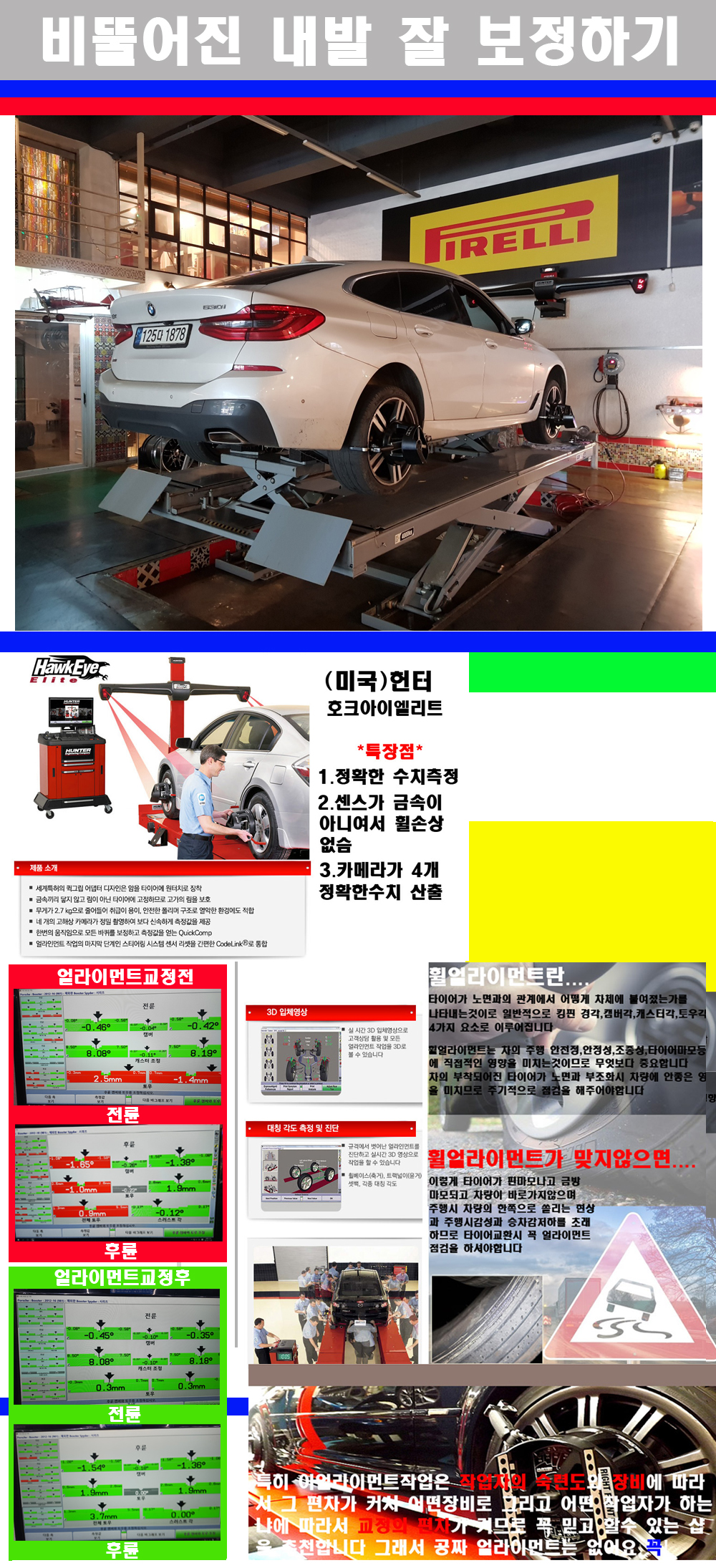 이후 미국 헌터사 호크아이엘리트 장비로 3D얼라이먼트를 진행했습니다 이장비는 현존하는 가장 진화된 얼라이먼트장비입니다 특히 4개의 고성능카메라가 장착되어져 있어 실시간으로 오차가 없는 측정값을 구현하며 바퀴당 각 휠센서 클램프가 프라스틱이며 타이어바닦면을 지지하는 방식이여서 휠의 손상이 없는것이 특징입니다 하지만 장비보다 차량의 얼라이먼트를 볼시 작업자의 정성과 그리고 능력과 숙련도가 관견이기에 꼭 휠얼라이먼트를 장사수단으로 하지않는 샵을 권장합니다 자사는 얼라이먼트정렬시 교정전 교정후를 구분하여 고객님께 직접 이수치값을 확인시켜드리고 작업을 하며 이후 각각의 특성을 가진 타이어들에 대해서 설명 및 관리요령 운전요령 같이 설명해드리고 있습니다 이후 타이어와 휠의 정확한 발란스값과 진동값을 보정후 헌터사 호크아이엘리트 3D얼라이먼트장비로 공장에서 처음 출고될시의 팩토리값으로 교정하였습니다 그리고 타이어질소가스주입기로 3번정도 진공상태로 만든후 질소가스를 주입했습니다 질소가스주입시 가장 관견은 순도이기에 이런 여러번의 진공상태후 주입하고 빼주는 과정를 많이 해주어야합니다 질소가스의 주입시 타이어공기압의 저하가 덜하고 화합물질이 반응을 하지않아 소음전파력과 그리고 타이어안쪽에 수분을 발생하지않으며 타이어안쪽에서의 공기압이 팽창하지않아 타이어에 스트레스를 덜주게 됩니다 하지만 이부분도 공기속에 질소가 80%정도 존재하기에 미미한 차이이지만 질소순도를 높이고 주행시 좋은 점이 확연히 많기에 질소주입을 해드리고 있습니다 특히 고성능타이어나 하중값을 많이 주는 타이어일경우에는 위에서 언급한 부분에서 많이 차이를 보이고 있습니다 이후 타이어왁싱후 출고했습니다+ 감사합니다 |