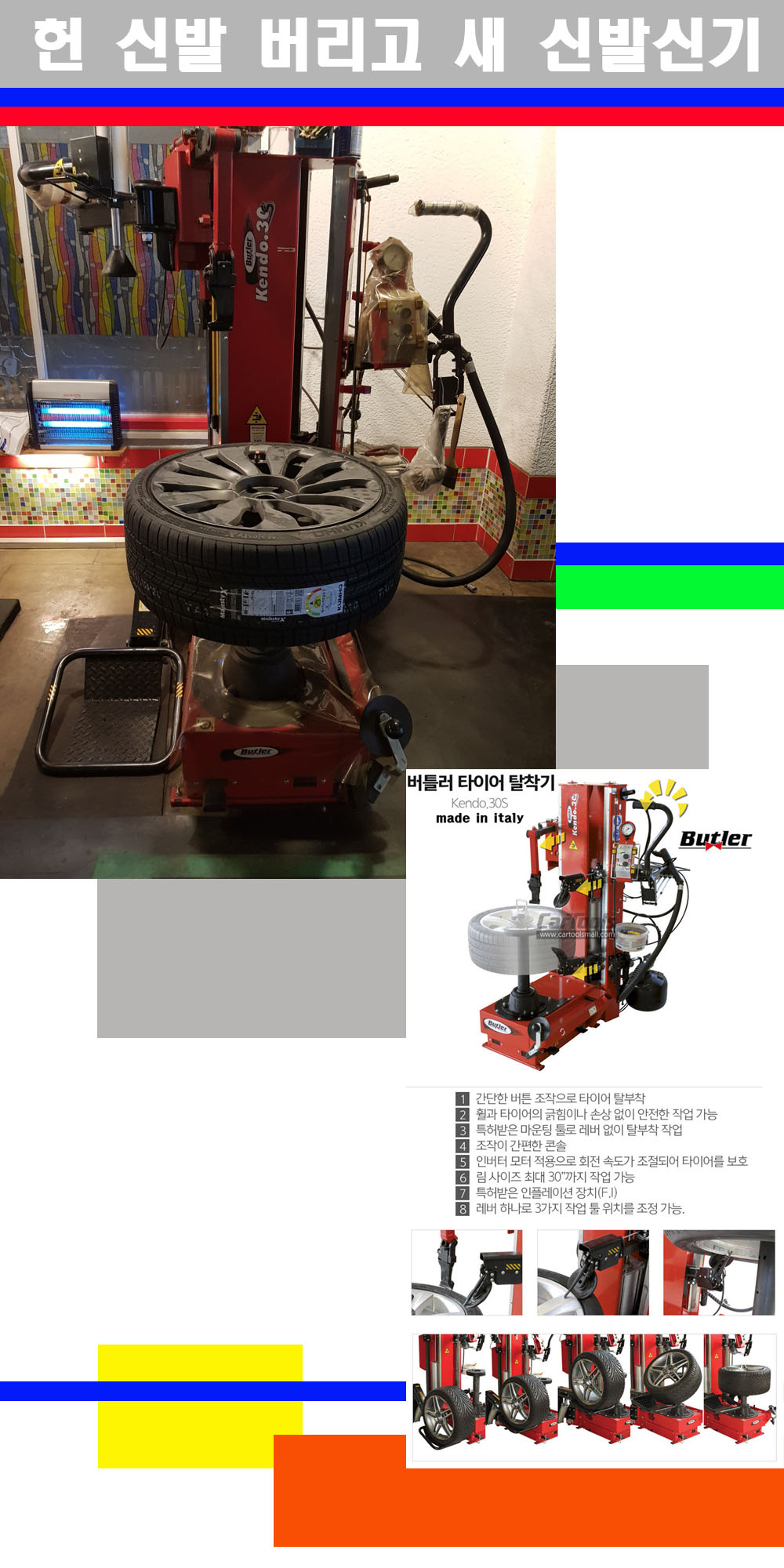 이태리 버틀러사의 켄도3.0S는 휠과 타이어와 조립과 분리시 전혀 제품에 손상을 주지않는 탈착기로 특히 센터락방식(중앙에서 휠를 고정하는 방식)이여서 휠의 중앙부위 잡아서 타이어를 탈부착하고 이후 상하롤러로 타이어를 탈부착합니다 특히 유니포미티작업(휠의 가장가벼운부분과 타이어의 가장 무거운부분을 매칭시키는 작업)시 작업자가 타이어를 정확한 지점에 휠과 매칭시킬수 있는 장점도 있습니다 유니포미티작업 불량시 과도한 진동값으로 핸들링불안 승차감저하 과도한 노면의 충격흡수를 가져와 주행감성을 해치는 첫번째 이유입니다 하지만 이런 작업을 무시하고 그냥 정적인 휠발란스작업만 하는것이 현실입니다 보통 타이어가격만 생각하시고 장착을 하시는데 꼭 이런 부분까지 챙길수 있는 샵을 권장합니다