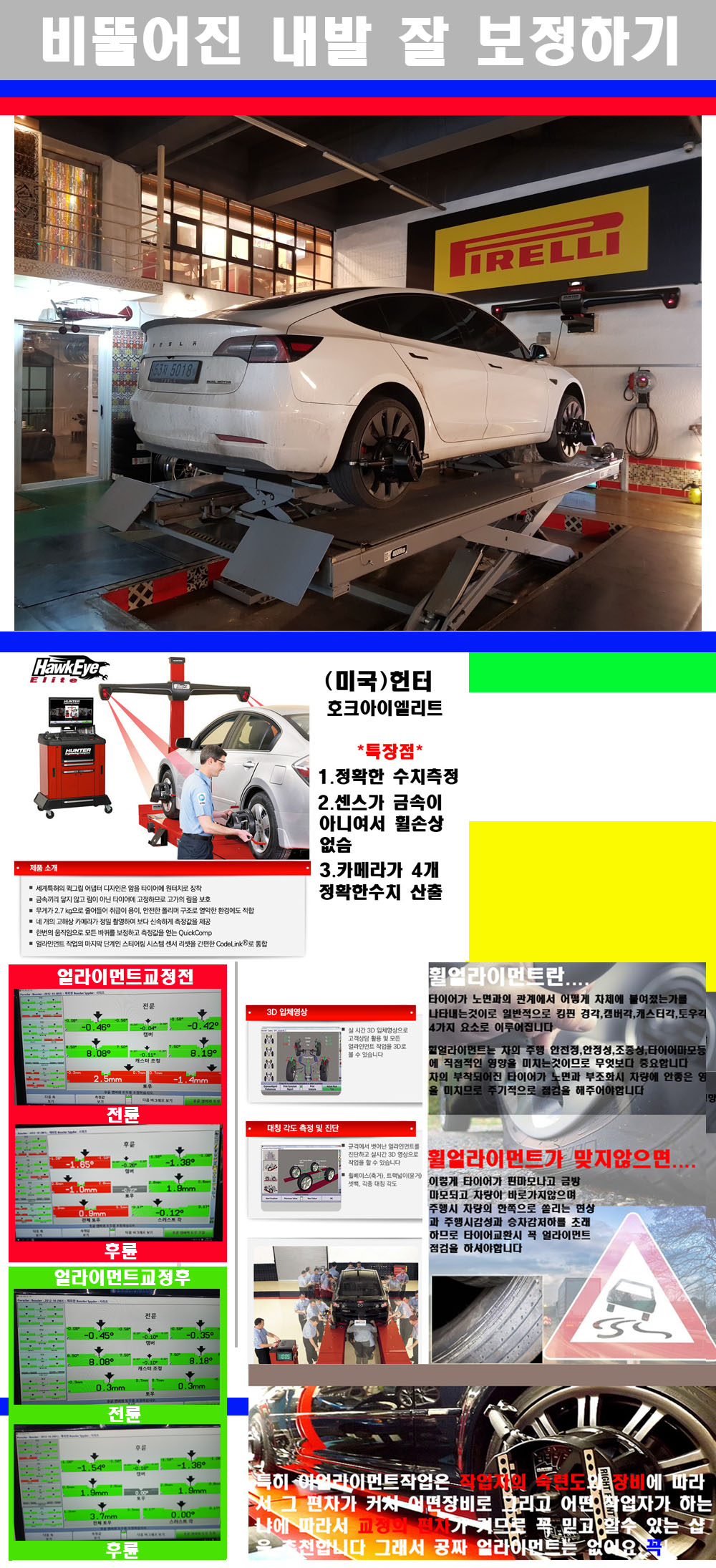 이후 미국 헌터사 호크아이엘리트 장비로 3D얼라이먼트를 진행했습니다 이장비는 현존하는 가장 진화된 얼라이먼트장비입니다 특히 4개의 고성능카메라가 장착되어져 있어 실시간으로 오차가 없는 측정값을 구현하며 바퀴당 각 휠센서 클램프가 프라스틱이며 타이어바닦면을 지지하는 방식이여서 휠의 손상이 없는것이 특징입니다 하지만 장비보다 차량의 얼라이먼트를 볼시 작업자의 정성과 그리고 능력과 숙련도가 관견이기에 꼭 휠얼라이먼트를 장사수단으로 하지않는 샵을 권장합니다 자사는 얼라이먼트정렬시 교정전 교정후를 구분하여 고객님께 직접 이수치값을 확인시켜드리고 작업을 하며 이후 각각의 특성을 가진 타이어들에 대해서 설명 및 관리요령 운전요령 같이 설명해드리고 있습니다 이후 타이어와 휠의 정확한 발란스값과 진동값을 보정후 헌터사 호크아이엘리트 3D얼라이먼트장비로 공장에서 처음 출고될시의 팩토리값으로 교정하였습니다 그리고 타이어질소가스주입기로 3번정도 진공상태로 만든후 질소가스를 주입했습니다 질소가스주입시 가장 관견은 순도이기에 이런 여러번의 진공상태후 주입하고 빼주는 과정를 많이 해주어야합니다 질소가스의 주입시 타이어공기압의 저하가 덜하고 화합물질이 반응을 하지않아 소음전파력과 그리고 타이어안쪽에 수분을 발생하지않으며 타이어안쪽에서의 공기압이 팽창하지않아 타이어에 스트레스를 덜주게 됩니다 하지만 이부분도 공기속에 질소가 80%정도 존재하기에 미미한 차이이지만 질소순도를 높이고 주행시 좋은 점이 확연히 많기에 질소주입을 해드리고 있습니다 특히 고성능타이어나 하중값을 많이 주는 타이어일경우에는 위에서 언급한 부분에서 많이 차이를 보이고 있습니다 이후 타이어왁싱후 출고했습니다+ 감사합니다 |