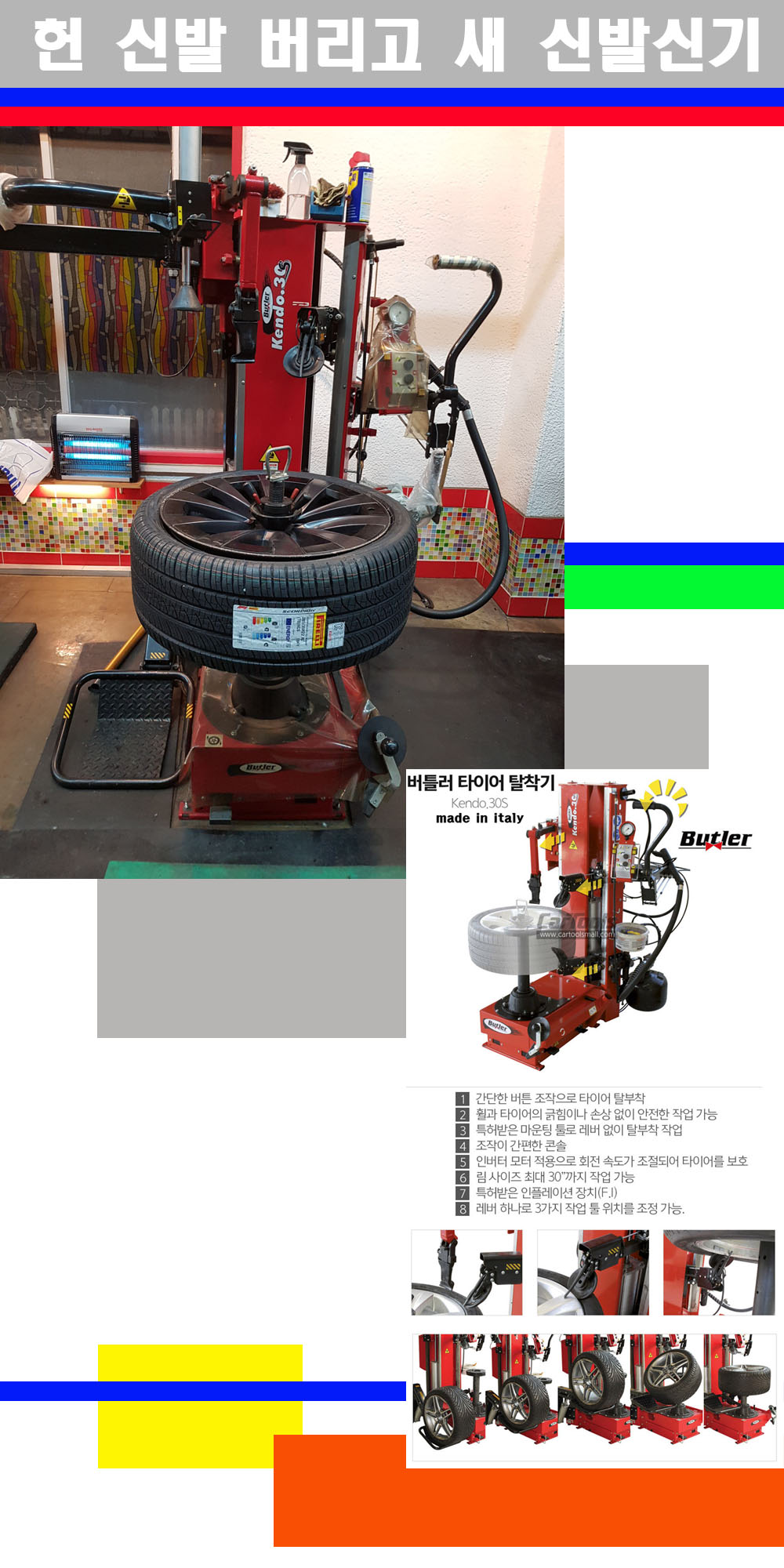 이태리 버틀러사의 켄도3.0S는 휠과 타이어와 조립과 분리시 전혀 제품에 손상을 주지않는 탈착기로 특히 센터락방식(중앙에서 휠를 고정하는 방식)이여서 휠의 중앙부위 잡아서 타이어를 탈부착하고 이후 상하롤러로 타이어를 탈부착합니다 특히 유니포미티작업(휠의 가장가벼운부분과 타이어의 가장 무거운부분을 매칭시키는 작업)시 작업자가 타이어를 정확한 지점에 휠과 매칭시킬수 있는 장점도 있습니다 유니포미티작업 불량시 과도한 진동값으로 핸들링불안 승차감저하 과도한 노면의 충격흡수를 가져와 주행감성을 해치는 첫번째 이유입니다 하지만 이런 작업을 무시하고 그냥 정적인 휠발란스작업만 하는것이 현실입니다 보통 타이어가격만 생각하시고 장착을 하시는데 꼭 이런 부분까지 챙길수 있는 샵을 권장합니다