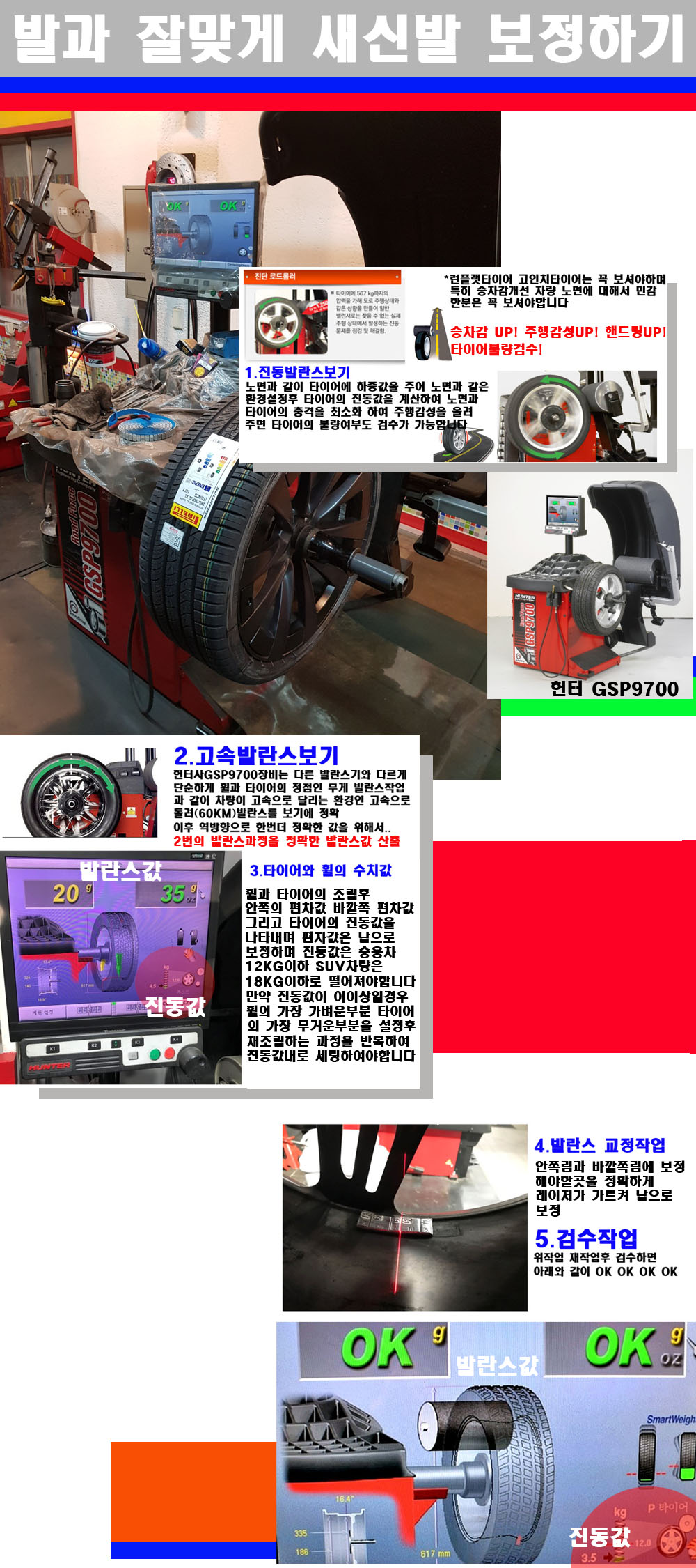 이후 미국 헌터사 GSP9700장비로 고속 및 진동발란스로 더욱더 작업의 정확도와 정밀도를 높였습니다 이장비는 노면에서 올라오는 진동값까지 계산하여 발란스값을 보는 방식으로 진동발란스기는 헌터사GSP9700장비가 유일합니다 이후 역방향으로 60키로의 고속으로 다시 발란스값을 보정하는 방식입니다 그래서 노면에서 올라오는 진동를 잡을수 있으며 특히 타이어의 노면력 측정으로 타이어의 불량여부까지도 검수가 가능한 장비입니다 특히 고속발란스 측정시 타사 발란스기와 틀리게 고속으로 발란스를 보기에 차량이 고속으로 달리는 시뮤레이션 구현이 가능하여 정확한 발란스값을 볼수가 있습니다 그리고 작업자에게는 불필요한 발란스납을 붙이지 않아 미관상으로 좋고 납을 절약하는 고객님에게도윈이고 작업자에게도 윈윈할수 있는 장비입니다 그리고 시중에서 고속진동발란스라고 말하시는 샵들이 많은데 꼭아셔야하는것은 고속발란스는 말그대로 발란스를 볼때 고속으로 돌리기에 60키로 전후 그리고 진동값을 계산하기위해서는 발란스기에 진동롤러가 있어야합니다 그래서 미국헌터사 GSP9700장비가 유일합니다
