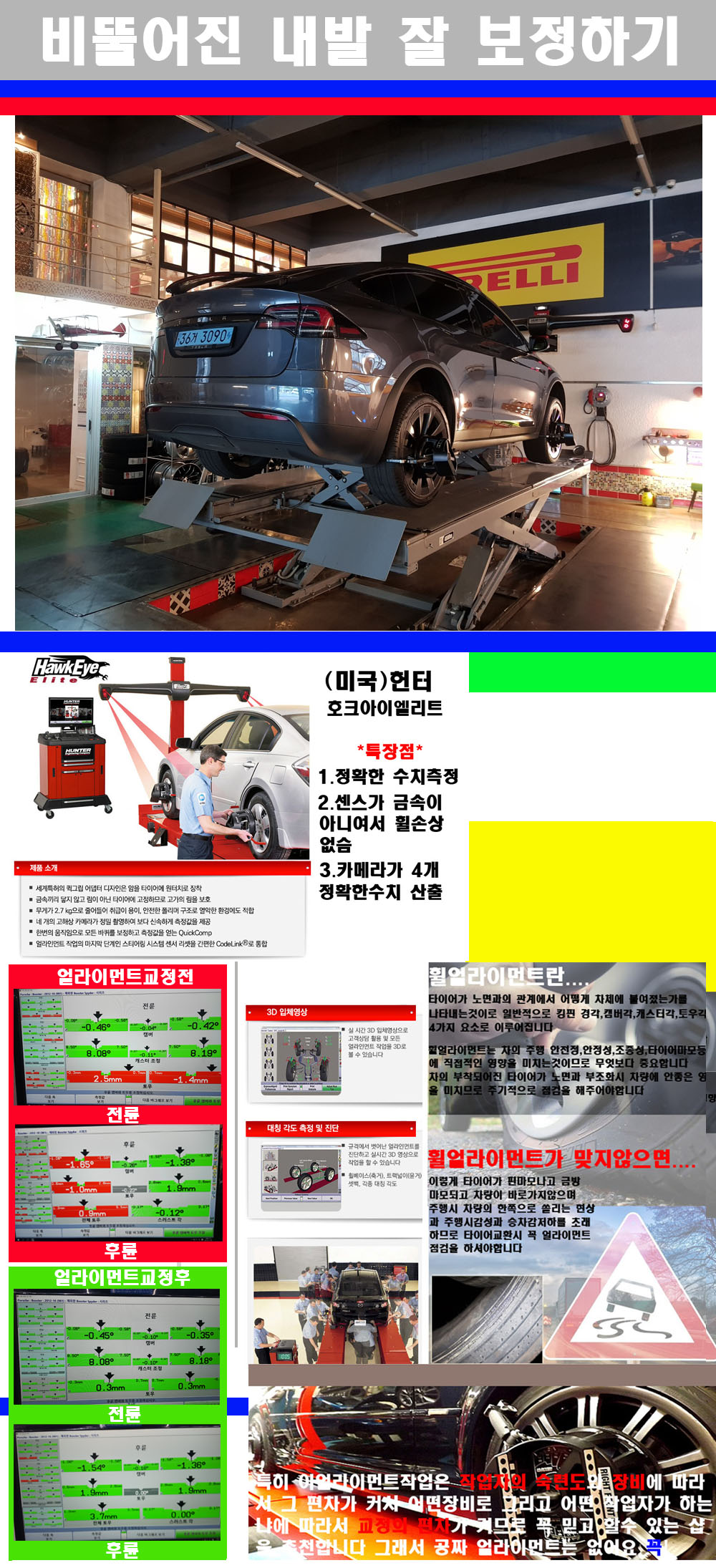 이후 미국 헌터사 호크아이엘리트 장비로 3D얼라이먼트를 진행했습니다 이장비는 현존하는 가장 진화된 얼라이먼트장비입니다 특히 4개의 고성능카메라가 장착되어져 있어 실시간으로 오차가 없는 측정값을 구현하며 바퀴당 각 휠센서 클램프가 프라스틱이며 타이어바닦면을 지지하는 방식이여서 휠의 손상이 없는것이 특징입니다 하지만 장비보다 차량의 얼라이먼트를 볼시 작업자의 정성과 그리고 능력과 숙련도가 관견이기에 꼭 휠얼라이먼트를 장사수단으로 하지않는 샵을 권장합니다 자사는 얼라이먼트정렬시 교정전 교정후를 구분하여 고객님께 직접 이수치값을 확인시켜드리고 작업을 하며 이후 각각의 특성을 가진 타이어들에 대해서 설명 및 관리요령 운전요령 같이 설명해드리고 있습니다 이후 타이어와 휠의 정확한 발란스값과 진동값을 보정후 헌터사 호크아이엘리트 3D얼라이먼트장비로 공장에서 처음 출고될시의 팩토리값으로 교정하였습니다 그리고 타이어질소가스주입기로 3번정도 진공상태로 만든후 질소가스를 주입했습니다 질소가스주입시 가장 관견은 순도이기에 이런 여러번의 진공상태후 주입하고 빼주는 과정를 많이 해주어야합니다 질소가스의 주입시 타이어공기압의 저하가 덜하고 화합물질이 반응을 하지않아 소음전파력과 그리고 타이어안쪽에 수분을 발생하지않으며 타이어안쪽에서의 공기압이 팽창하지않아 타이어에 스트레스를 덜주게 됩니다 하지만 이부분도 공기속에 질소가 80%정도 존재하기에 미미한 차이이지만 질소순도를 높이고 주행시 좋은 점이 확연히 많기에 질소주입을 해드리고 있습니다 특히 고성능타이어나 하중값을 많이 주는 타이어일경우에는 위에서 언급한 부분에서 많이 차이를 보이고 있습니다 이후 타이어왁싱후 출고했습니다+ 감사합니다 |
