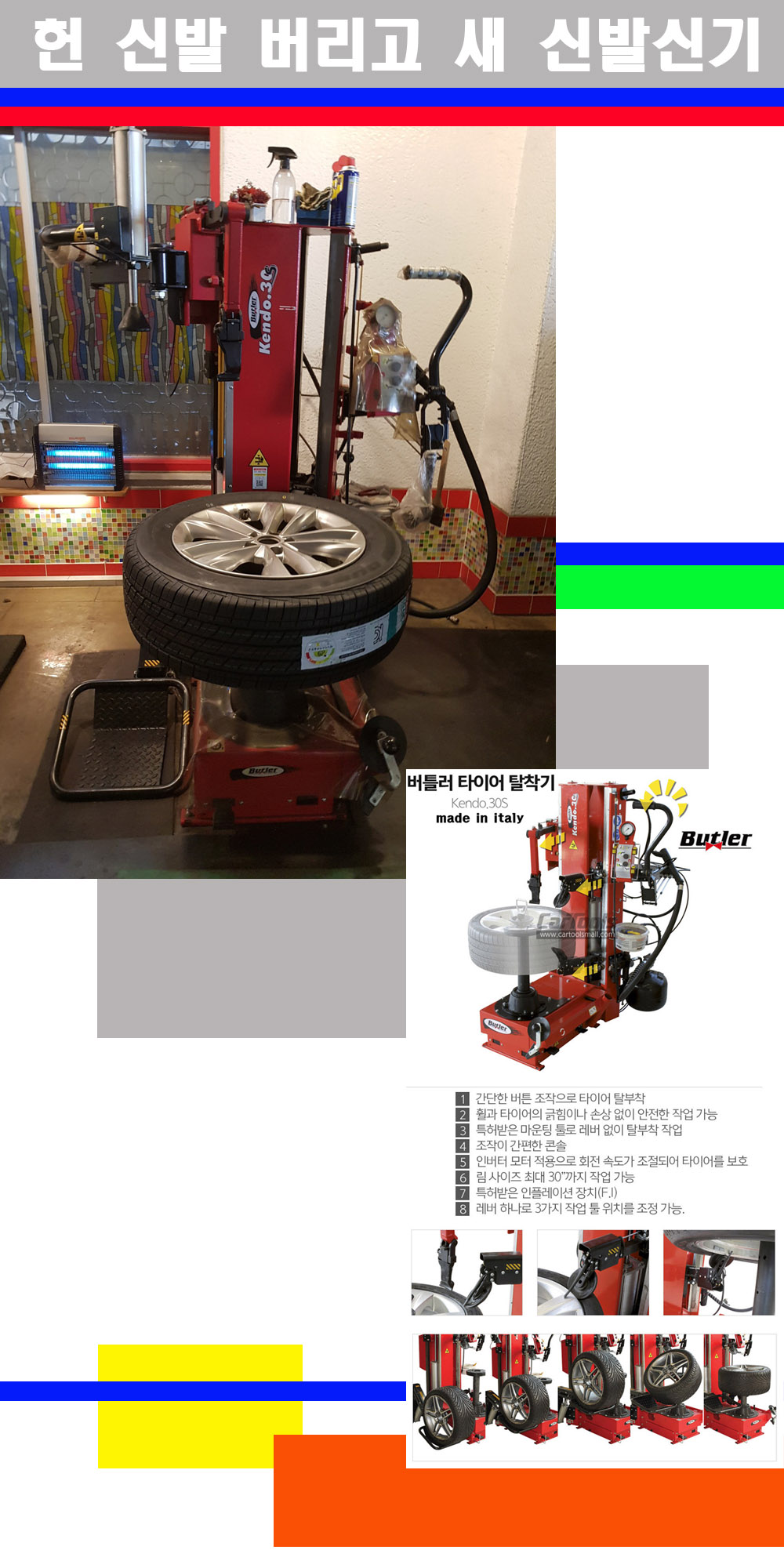 이태리 버틀러사의 켄도3.0S는 휠과 타이어와 조립과 분리시 전혀 제품에 손상을 주지않는 탈착기로 특히 센터락방식(중앙에서 휠를 고정하는 방식)이여서 휠의 중앙부위 잡아서 타이어를 탈부착하고 이후 상하롤러로 타이어를 탈부착합니다 특히 유니포미티작업(휠의 가장가벼운부분과 타이어의 가장 무거운부분을 매칭시키는 작업)시 작업자가 타이어를 정확한 지점에 휠과 매칭시킬수 있는 장점도 있습니다 유니포미티작업 불량시 과도한 진동값으로 핸들링불안 승차감저하 과도한 노면의 충격흡수를 가져와 주행감성을 해치는 첫번째 이유입니다 하지만 이런 작업을 무시하고 그냥 정적인 휠발란스작업만 하는것이 현실입니다 보통 타이어가격만 생각하시고 장착을 하시는데 꼭 이런 부분까지 챙길수 있는 샵을 권장합니다