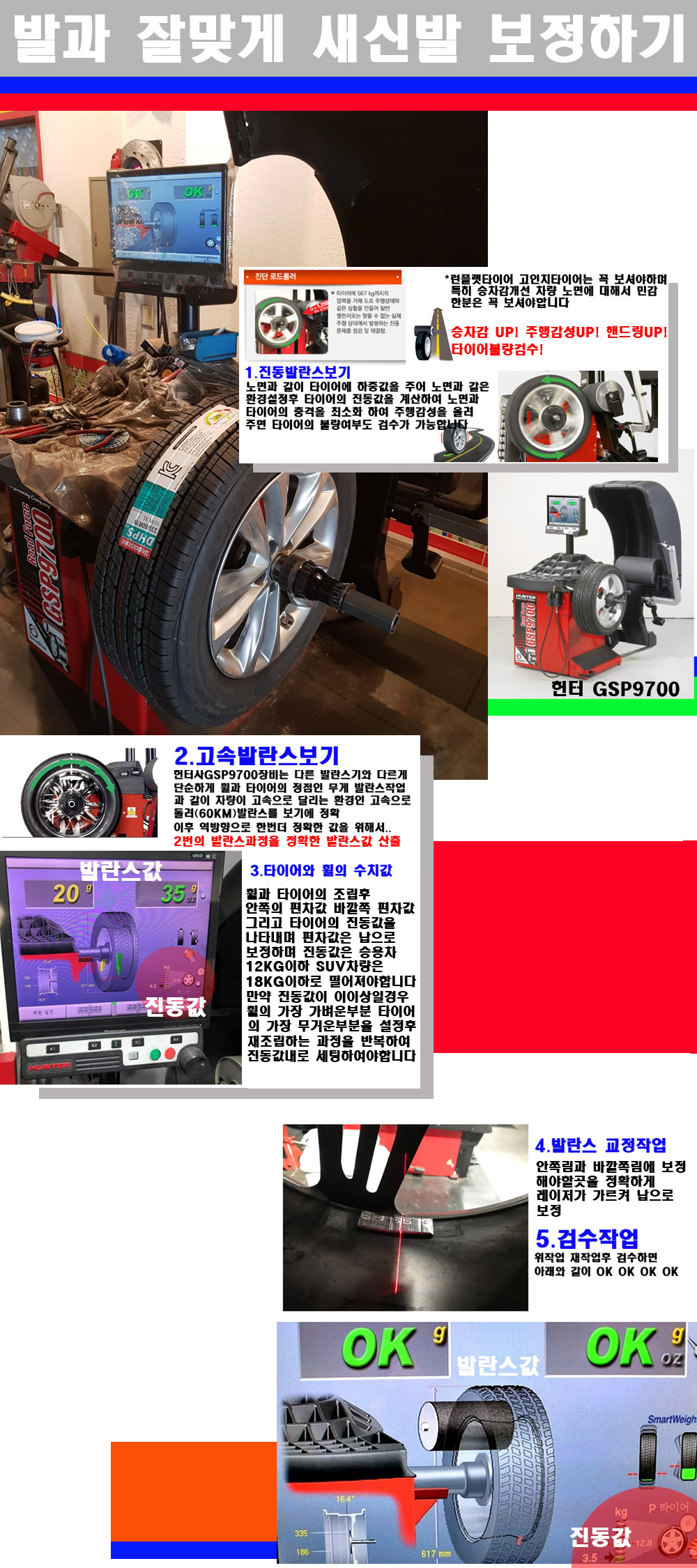 이후 미국 헌터사 GSP9700장비로 고속 및 진동발란스로 더욱더 작업의 정확도와 정밀도를 높였습니다 이장비는 노면에서 올라오는 진동값까지 계산하여 발란스값을 보는 방식으로 진동발란스기는 헌터사GSP9700장비가 유일합니다 이후 역방향으로 60키로의 고속으로 다시 발란스값을 보정하는 방식입니다 그래서 노면에서 올라오는 진동를 잡을수 있으며 특히 타이어의 노면력 측정으로 타이어의 불량여부까지도 검수가 가능한 장비입니다 특히 고속발란스 측정시 타사 발란스기와 틀리게 고속으로 발란스를 보기에 차량이 고속으로 달리는 시뮤레이션 구현이 가능하여 정확한 발란스값을 볼수가 있습니다 그리고 작업자에게는 불필요한 발란스납을 붙이지 않아 미관상으로 좋고 납을 절약하는 고객님에게도윈이고 작업자에게도 윈윈할수 있는 장비입니다 그리고 시중에서 고속진동발란스라고 말하시는 샵들이 많은데 꼭아셔야하는것은 고속발란스는 말그대로 발란스를 볼때 고속으로 돌리기에 60키로 전후 그리고 진동값을 계산하기위해서는 발란스기에 진동롤러가 있어야합니다 그래서 미국헌터사 GSP9700장비가 유일합니다