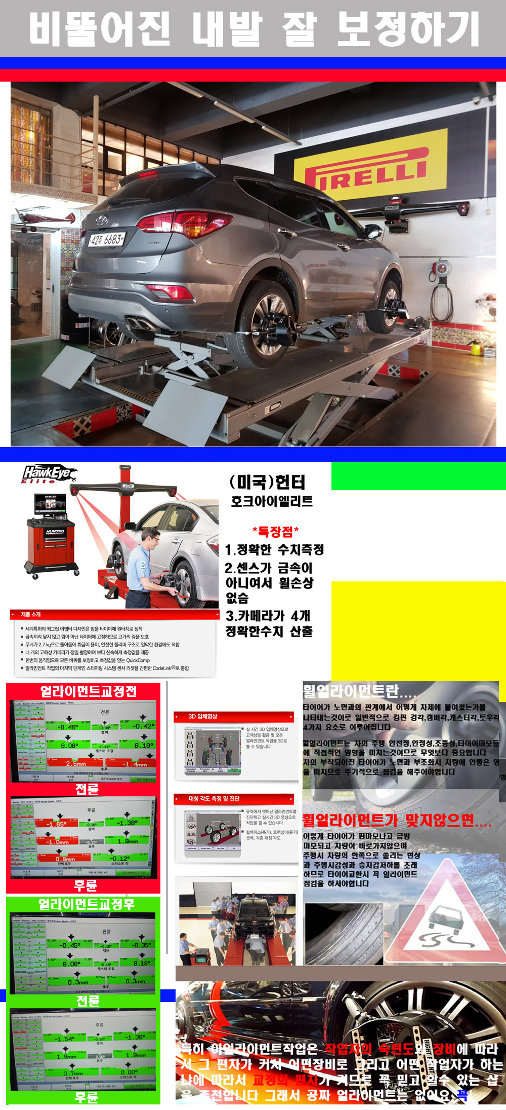 이후 미국 헌터사 호크아이엘리트 장비로 3D얼라이먼트를 진행했습니다 이장비는 현존하는 가장 진화된 얼라이먼트장비입니다 특히 4개의 고성능카메라가 장착되어져 있어 실시간으로 오차가 없는 측정값을 구현하며 바퀴당 각 휠센서 클램프가 프라스틱이며 타이어바닦면을 지지하는 방식이여서 휠의 손상이 없는것이 특징입니다 하지만 장비보다 차량의 얼라이먼트를 볼시 작업자의 정성과 그리고 능력과 숙련도가 관견이기에 꼭 휠얼라이먼트를 장사수단으로 하지않는 샵을 권장합니다 자사는 얼라이먼트정렬시 교정전 교정후를 구분하여 고객님께 직접 이수치값을 확인시켜드리고 작업을 하며 이후 각각의 특성을 가진 타이어들에 대해서 설명 및 관리요령 운전요령 같이 설명해드리고 있습니다 이후 타이어와 휠의 정확한 발란스값과 진동값을 보정후 헌터사 호크아이엘리트 3D얼라이먼트장비로 공장에서 처음 출고될시의 팩토리값으로 교정하였습니다 그리고 타이어질소가스주입기로 3번정도 진공상태로 만든후 질소가스를 주입했습니다 질소가스주입시 가장 관견은 순도이기에 이런 여러번의 진공상태후 주입하고 빼주는 과정를 많이 해주어야합니다 질소가스의 주입시 타이어공기압의 저하가 덜하고 화합물질이 반응을 하지않아 소음전파력과 그리고 타이어안쪽에 수분을 발생하지않으며 타이어안쪽에서의 공기압이 팽창하지않아 타이어에 스트레스를 덜주게 됩니다 하지만 이부분도 공기속에 질소가 80%정도 존재하기에 미미한 차이이지만 질소순도를 높이고 주행시 좋은 점이 확연히 많기에 질소주입을 해드리고 있습니다 특히 고성능타이어나 하중값을 많이 주는 타이어일경우에는 위에서 언급한 부분에서 많이 차이를 보이고 있습니다 이후 타이어왁싱후 출고했습니다+ 감사합니다 |