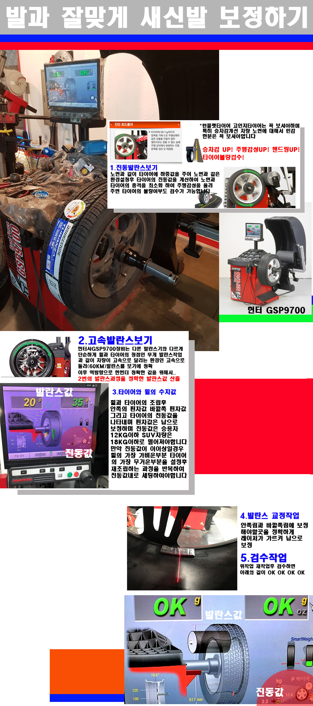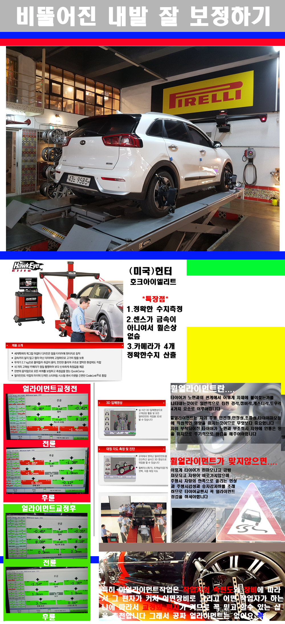 이후 미국 헌터사 호크아이엘리트 장비로 3D얼라이먼트를 진행했습니다 이장비는 현존하는 가장 진화된 얼라이먼트장비입니다 특히 4개의 고성능카메라가 장착되어져 있어 실시간으로 오차가 없는 측정값을 구현하며 바퀴당 각 휠센서 클램프가 프라스틱이며 타이어바닦면을 지지하는 방식이여서 휠의 손상이 없는것이 특징입니다 하지만 장비보다 차량의 얼라이먼트를 볼시 작업자의 정성과 그리고 능력과 숙련도가 관견이기에 꼭 휠얼라이먼트를 장사수단으로 하지않는 샵을 권장합니다 자사는 얼라이먼트정렬시 교정전 교정후를 구분하여 고객님께 직접 이수치값을 확인시켜드리고 작업을 하며 이후 각각의 특성을 가진 타이어들에 대해서 설명 및 관리요령 운전요령 같이 설명해드리고 있습니다 이후 타이어와 휠의 정확한 발란스값과 진동값을 보정후 헌터사 호크아이엘리트 3D얼라이먼트장비로 공장에서 처음 출고될시의 팩토리값으로 교정하였습니다 그리고 타이어질소가스주입기로 3번정도 진공상태로 만든후 질소가스를 주입했습니다 질소가스주입시 가장 관견은 순도이기에 이런 여러번의 진공상태후 주입하고 빼주는 과정를 많이 해주어야합니다 질소가스의 주입시 타이어공기압의 저하가 덜하고 화합물질이 반응을 하지않아 소음전파력과 그리고 타이어안쪽에 수분을 발생하지않으며 타이어안쪽에서의 공기압이 팽창하지않아 타이어에 스트레스를 덜주게 됩니다 하지만 이부분도 공기속에 질소가 80%정도 존재하기에 미미한 차이이지만 질소순도를 높이고 주행시 좋은 점이 확연히 많기에 질소주입을 해드리고 있습니다 특히 고성능타이어나 하중값을 많이 주는 타이어일경우에는 위에서 언급한 부분에서 많이 차이를 보이고 있습니다 이후 타이어왁싱후 출고했습니다+ 감사합니다 |