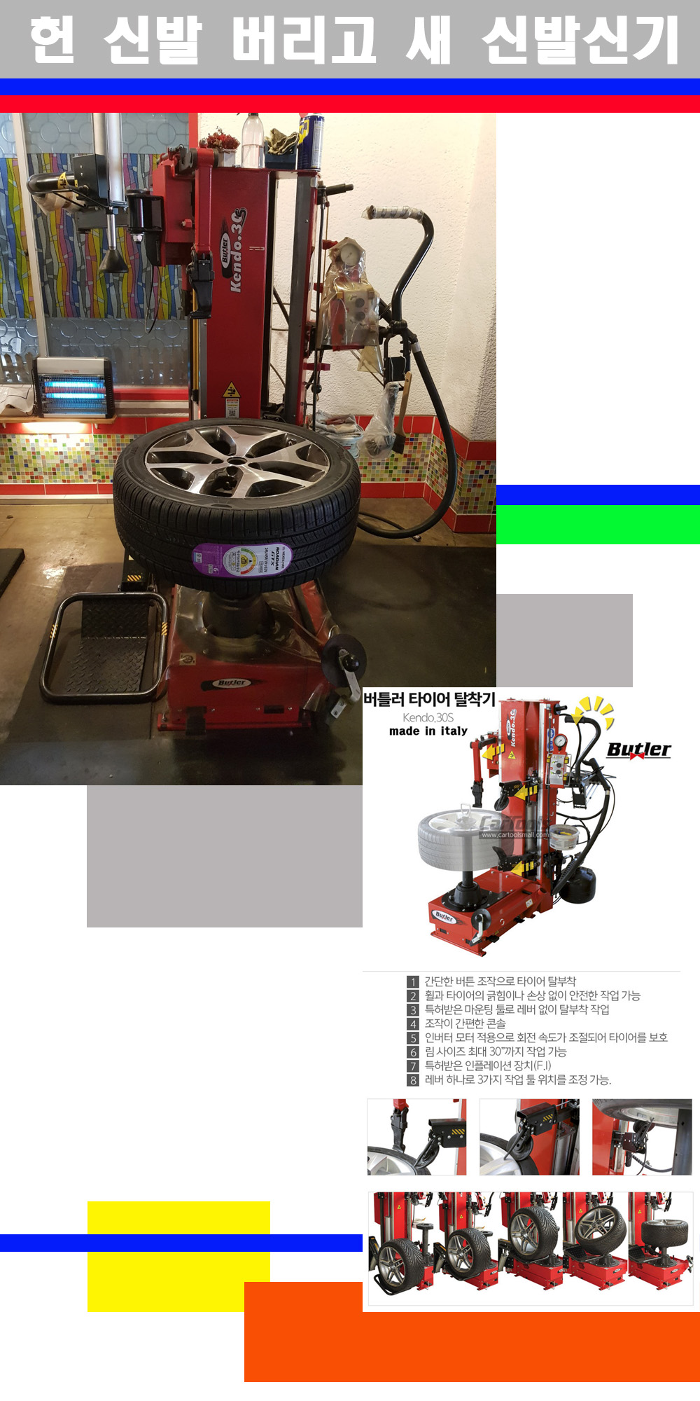 이태리 버틀러사의 켄도3.0S는 휠과 타이어와 조립과 분리시 전혀 제품에 손상을 주지않는 탈착기로 특히 센터락방식(중앙에서 휠를 고정하는 방식)이여서 휠의 중앙부위 잡아서 타이어를 탈부착하고 이후 상하롤러로 타이어를 탈부착합니다 특히 유니포미티작업(휠의 가장가벼운부분과 타이어의 가장 무거운부분을 매칭시키는 작업)시 작업자가 타이어를 정확한 지점에 휠과 매칭시킬수 있는 장점도 있습니다 유니포미티작업 불량시 과도한 진동값으로 핸들링불안 승차감저하 과도한 노면의 충격흡수를 가져와 주행감성을 해치는 첫번째 이유입니다 하지만 이런 작업을 무시하고 그냥 정적인 휠발란스작업만 하는것이 현실입니다 보통 타이어가격만 생각하시고 장착을 하시는데 꼭 이런 부분까지 챙길수 있는 샵을 권장합니다