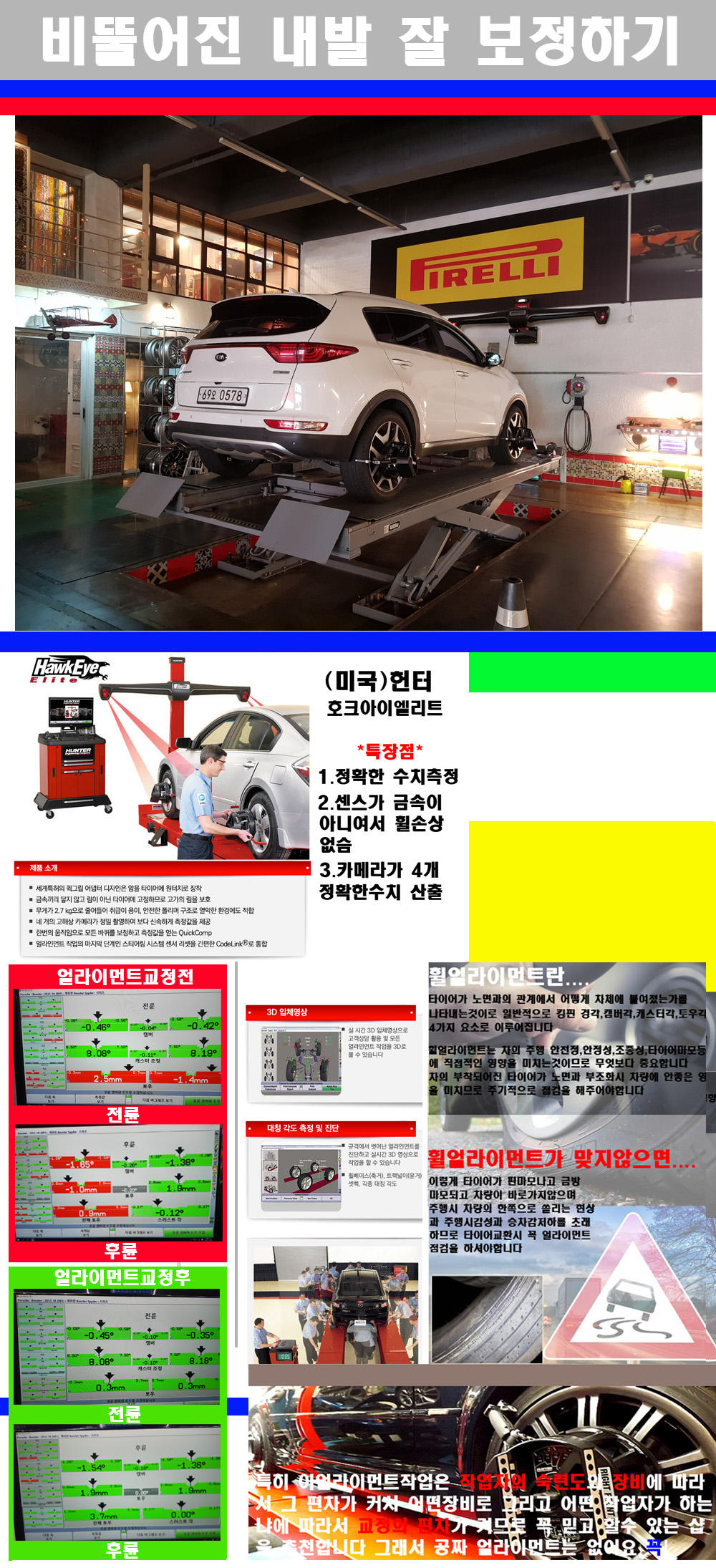 이후 미국 헌터사 호크아이엘리트 장비로 3D얼라이먼트를 진행했습니다 이장비는 현존하는 가장 진화된 얼라이먼트장비입니다 특히 4개의 고성능카메라가 장착되어져 있어 실시간으로 오차가 없는 측정값을 구현하며 바퀴당 각 휠센서 클램프가 프라스틱이며 타이어바닦면을 지지하는 방식이여서 휠의 손상이 없는것이 특징입니다 하지만 장비보다 차량의 얼라이먼트를 볼시 작업자의 정성과 그리고 능력과 숙련도가 관견이기에 꼭 휠얼라이먼트를 장사수단으로 하지않는 샵을 권장합니다 자사는 얼라이먼트정렬시 교정전 교정후를 구분하여 고객님께 직접 이수치값을 확인시켜드리고 작업을 하며 이후 각각의 특성을 가진 타이어들에 대해서 설명 및 관리요령 운전요령 같이 설명해드리고 있습니다 이후 타이어와 휠의 정확한 발란스값과 진동값을 보정후 헌터사 호크아이엘리트 3D얼라이먼트장비로 공장에서 처음 출고될시의 팩토리값으로 교정하였습니다 그리고 타이어질소가스주입기로 3번정도 진공상태로 만든후 질소가스를 주입했습니다 질소가스주입시 가장 관견은 순도이기에 이런 여러번의 진공상태후 주입하고 빼주는 과정를 많이 해주어야합니다 질소가스의 주입시 타이어공기압의 저하가 덜하고 화합물질이 반응을 하지않아 소음전파력과 그리고 타이어안쪽에 수분을 발생하지않으며 타이어안쪽에서의 공기압이 팽창하지않아 타이어에 스트레스를 덜주게 됩니다 하지만 이부분도 공기속에 질소가 80%정도 존재하기에 미미한 차이이지만 질소순도를 높이고 주행시 좋은 점이 확연히 많기에 질소주입을 해드리고 있습니다 특히 고성능타이어나 하중값을 많이 주는 타이어일경우에는 위에서 언급한 부분에서 많이 차이를 보이고 있습니다 이후 타이어왁싱후 출고했습니다+ 감사합니다 |