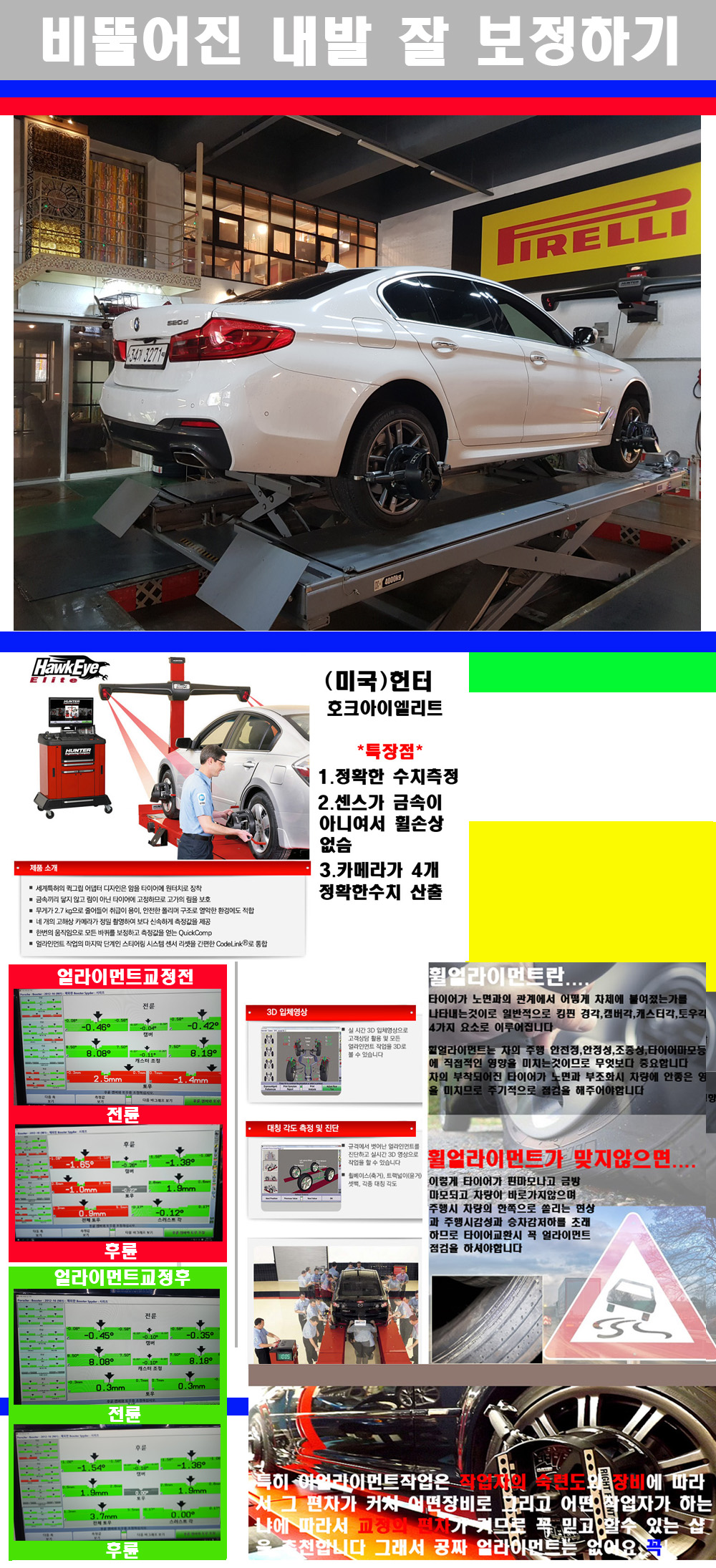 이후 미국 헌터사 호크아이엘리트 장비로 3D얼라이먼트를 진행했습니다 이장비는 현존하는 가장 진화된 얼라이먼트장비입니다 특히 4개의 고성능카메라가 장착되어져 있어 실시간으로 오차가 없는 측정값을 구현하며 바퀴당 각 휠센서 클램프가 프라스틱이며 타이어바닦면을 지지하는 방식이여서 휠의 손상이 없는것이 특징입니다 하지만 장비보다 차량의 얼라이먼트를 볼시 작업자의 정성과 그리고 능력과 숙련도가 관견이기에 꼭 휠얼라이먼트를 장사수단으로 하지않는 샵을 권장합니다 자사는 얼라이먼트정렬시 교정전 교정후를 구분하여 고객님께 직접 이수치값을 확인시켜드리고 작업을 하며 이후 각각의 특성을 가진 타이어들에 대해서 설명 및 관리요령 운전요령 같이 설명해드리고 있습니다 이후 타이어와 휠의 정확한 발란스값과 진동값을 보정후 헌터사 호크아이엘리트 3D얼라이먼트장비로 공장에서 처음 출고될시의 팩토리값으로 교정하였습니다 그리고 타이어질소가스주입기로 3번정도 진공상태로 만든후 질소가스를 주입했습니다 질소가스주입시 가장 관견은 순도이기에 이런 여러번의 진공상태후 주입하고 빼주는 과정를 많이 해주어야합니다 질소가스의 주입시 타이어공기압의 저하가 덜하고 화합물질이 반응을 하지않아 소음전파력과 그리고 타이어안쪽에 수분을 발생하지않으며 타이어안쪽에서의 공기압이 팽창하지않아 타이어에 스트레스를 덜주게 됩니다 하지만 이부분도 공기속에 질소가 80%정도 존재하기에 미미한 차이이지만 질소순도를 높이고 주행시 좋은 점이 확연히 많기에 질소주입을 해드리고 있습니다 특히 고성능타이어나 하중값을 많이 주는 타이어일경우에는 위에서 언급한 부분에서 많이 차이를 보이고 있습니다 이후 타이어왁싱후 출고했습니다+ 감사합니다 |