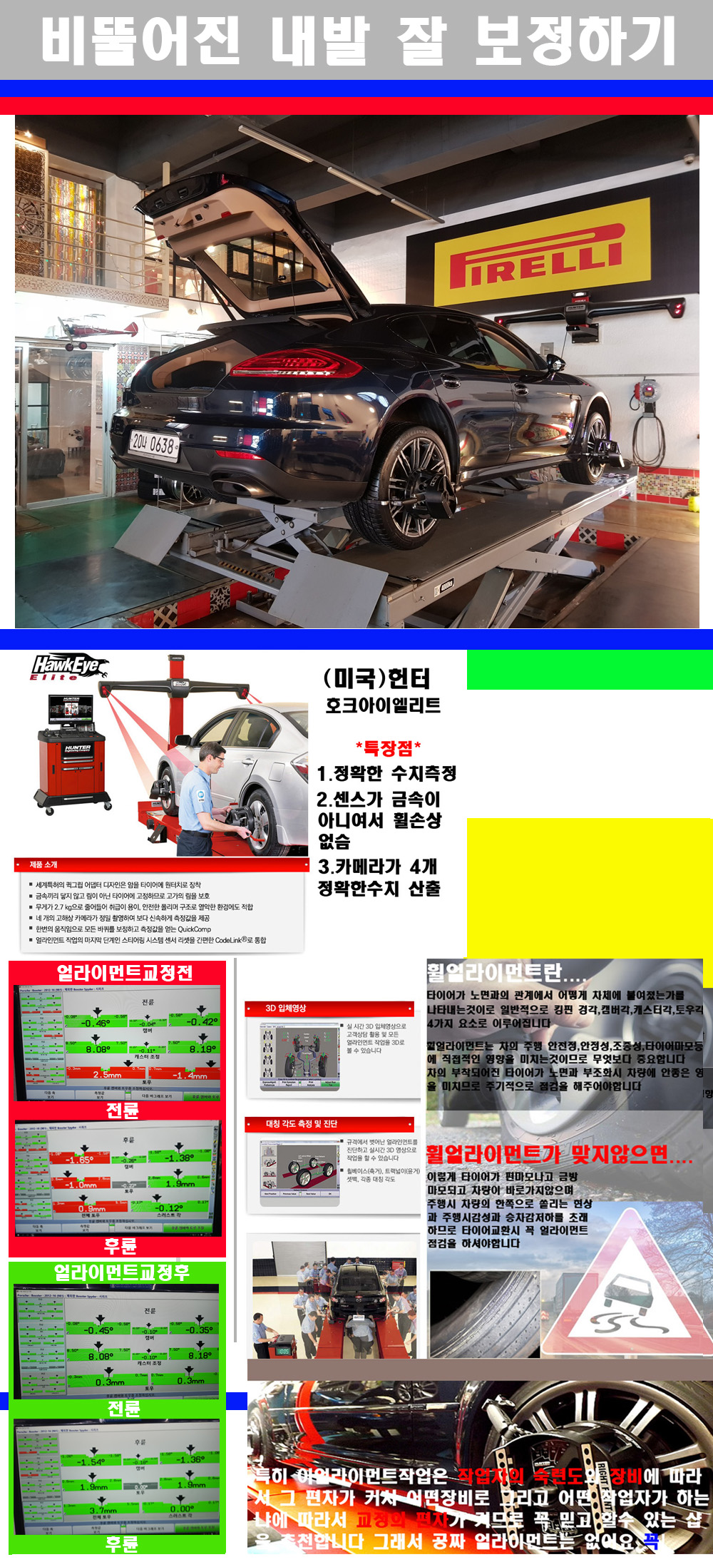이후 미국 헌터사 호크아이엘리트 장비로 3D얼라이먼트를 진행했습니다 이장비는 현존하는 가장 진화된 얼라이먼트장비입니다 특히 4개의 고성능카메라가 장착되어져 있어 실시간으로 오차가 없는 측정값을 구현하며 바퀴당 각 휠센서 클램프가 프라스틱이며 타이어바닦면을 지지하는 방식이여서 휠의 손상이 없는것이 특징입니다 하지만 장비보다 차량의 얼라이먼트를 볼시 작업자의 정성과 그리고 능력과 숙련도가 관견이기에 꼭 휠얼라이먼트를 장사수단으로 하지않는 샵을 권장합니다 자사는 얼라이먼트정렬시 교정전 교정후를 구분하여 고객님께 직접 이수치값을 확인시켜드리고 작업을 하며 이후 각각의 특성을 가진 타이어들에 대해서 설명 및 관리요령 운전요령 같이 설명해드리고 있습니다 이후 타이어와 휠의 정확한 발란스값과 진동값을 보정후 헌터사 호크아이엘리트 3D얼라이먼트장비로 공장에서 처음 출고될시의 팩토리값으로 교정하였습니다 그리고 타이어질소가스주입기로 3번정도 진공상태로 만든후 질소가스를 주입했습니다 질소가스주입시 가장 관견은 순도이기에 이런 여러번의 진공상태후 주입하고 빼주는 과정를 많이 해주어야합니다 질소가스의 주입시 타이어공기압의 저하가 덜하고 화합물질이 반응을 하지않아 소음전파력과 그리고 타이어안쪽에 수분을 발생하지않으며 타이어안쪽에서의 공기압이 팽창하지않아 타이어에 스트레스를 덜주게 됩니다 하지만 이부분도 공기속에 질소가 80%정도 존재하기에 미미한 차이이지만 질소순도를 높이고 주행시 좋은 점이 확연히 많기에 질소주입을 해드리고 있습니다 특히 고성능타이어나 하중값을 많이 주는 타이어일경우에는 위에서 언급한 부분에서 많이 차이를 보이고 있습니다 이후 타이어왁싱후 출고했습니다+ 감사합니다 |