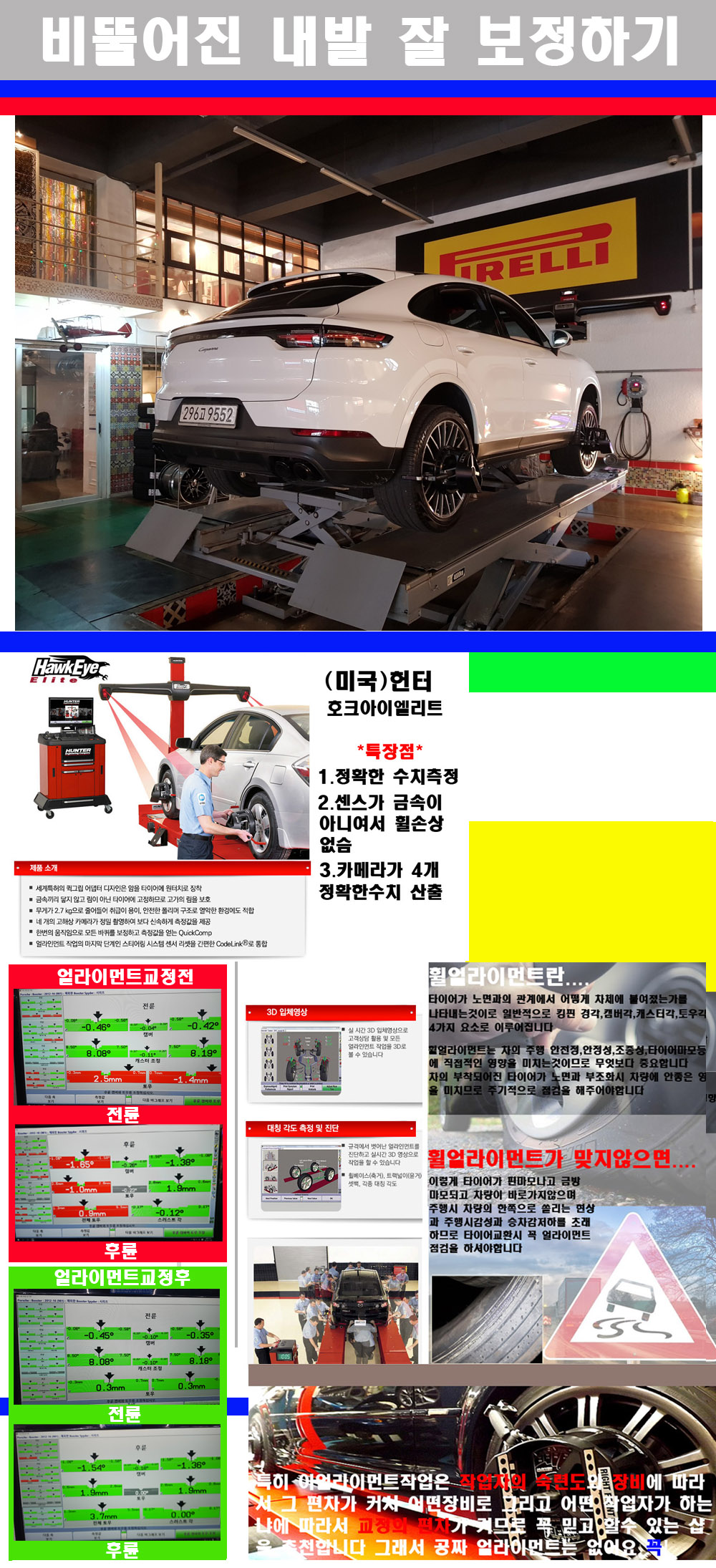 이후 미국 헌터사 호크아이엘리트 장비로 3D얼라이먼트를 진행했습니다 이장비는 현존하는 가장 진화된 얼라이먼트장비입니다 특히 4개의 고성능카메라가 장착되어져 있어 실시간으로 오차가 없는 측정값을 구현하며 바퀴당 각 휠센서 클램프가 프라스틱이며 타이어바닦면을 지지하는 방식이여서 휠의 손상이 없는것이 특징입니다 하지만 장비보다 차량의 얼라이먼트를 볼시 작업자의 정성과 그리고 능력과 숙련도가 관견이기에 꼭 휠얼라이먼트를 장사수단으로 하지않는 샵을 권장합니다 자사는 얼라이먼트정렬시 교정전 교정후를 구분하여 고객님께 직접 이수치값을 확인시켜드리고 작업을 하며 이후 각각의 특성을 가진 타이어들에 대해서 설명 및 관리요령 운전요령 같이 설명해드리고 있습니다 이후 타이어와 휠의 정확한 발란스값과 진동값을 보정후 헌터사 호크아이엘리트 3D얼라이먼트장비로 공장에서 처음 출고될시의 팩토리값으로 교정하였습니다 그리고 타이어질소가스주입기로 3번정도 진공상태로 만든후 질소가스를 주입했습니다 질소가스주입시 가장 관견은 순도이기에 이런 여러번의 진공상태후 주입하고 빼주는 과정를 많이 해주어야합니다 질소가스의 주입시 타이어공기압의 저하가 덜하고 화합물질이 반응을 하지않아 소음전파력과 그리고 타이어안쪽에 수분을 발생하지않으며 타이어안쪽에서의 공기압이 팽창하지않아 타이어에 스트레스를 덜주게 됩니다 하지만 이부분도 공기속에 질소가 80%정도 존재하기에 미미한 차이이지만 질소순도를 높이고 주행시 좋은 점이 확연히 많기에 질소주입을 해드리고 있습니다 특히 고성능타이어나 하중값을 많이 주는 타이어일경우에는 위에서 언급한 부분에서 많이 차이를 보이고 있습니다 이후 타이어왁싱후 출고했습니다+ 감사합니다 |