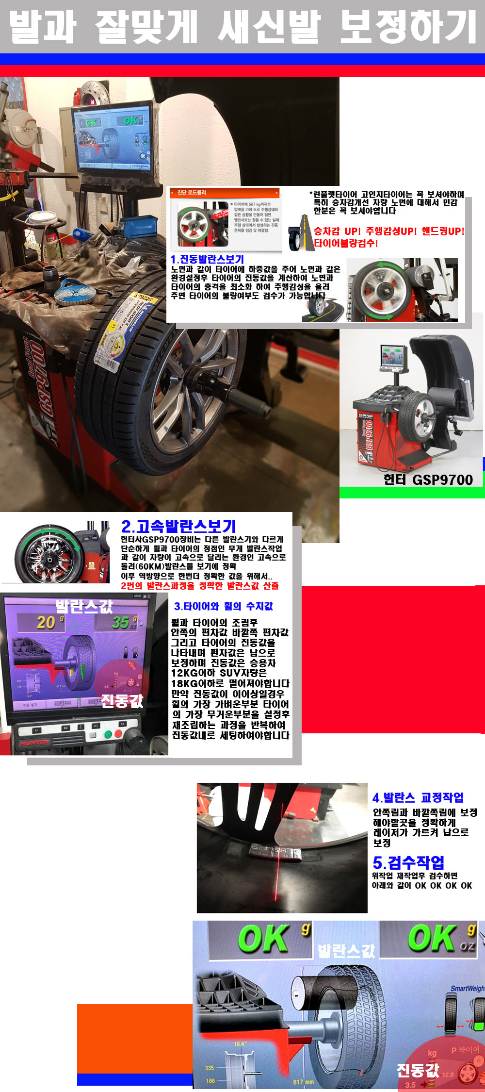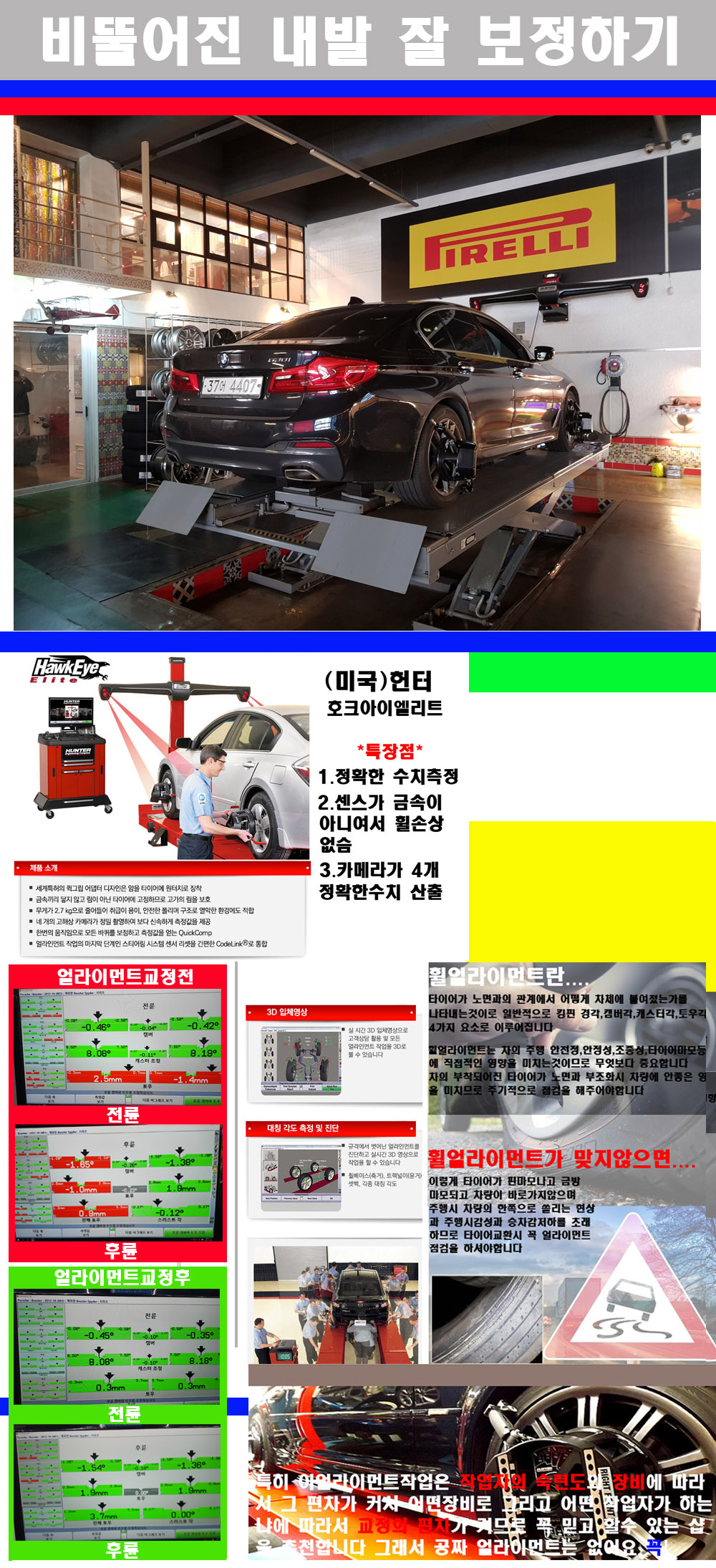 이후 미국 헌터사 호크아이엘리트 장비로 3D얼라이먼트를 진행했습니다 이장비는 현존하는 가장 진화된 얼라이먼트장비입니다 특히 4개의 고성능카메라가 장착되어져 있어 실시간으로 오차가 없는 측정값을 구현하며 바퀴당 각 휠센서 클램프가 프라스틱이며 타이어바닦면을 지지하는 방식이여서 휠의 손상이 없는것이 특징입니다 하지만 장비보다 차량의 얼라이먼트를 볼시 작업자의 정성과 그리고 능력과 숙련도가 관견이기에 꼭 휠얼라이먼트를 장사수단으로 하지않는 샵을 권장합니다 자사는 얼라이먼트정렬시 교정전 교정후를 구분하여 고객님께 직접 이수치값을 확인시켜드리고 작업을 하며 이후 각각의 특성을 가진 타이어들에 대해서 설명 및 관리요령 운전요령 같이 설명해드리고 있습니다 이후 타이어와 휠의 정확한 발란스값과 진동값을 보정후 헌터사 호크아이엘리트 3D얼라이먼트장비로 공장에서 처음 출고될시의 팩토리값으로 교정하였습니다 그리고 타이어질소가스주입기로 3번정도 진공상태로 만든후 질소가스를 주입했습니다 질소가스주입시 가장 관견은 순도이기에 이런 여러번의 진공상태후 주입하고 빼주는 과정를 많이 해주어야합니다 질소가스의 주입시 타이어공기압의 저하가 덜하고 화합물질이 반응을 하지않아 소음전파력과 그리고 타이어안쪽에 수분을 발생하지않으며 타이어안쪽에서의 공기압이 팽창하지않아 타이어에 스트레스를 덜주게 됩니다 하지만 이부분도 공기속에 질소가 80%정도 존재하기에 미미한 차이이지만 질소순도를 높이고 주행시 좋은 점이 확연히 많기에 질소주입을 해드리고 있습니다 특히 고성능타이어나 하중값을 많이 주는 타이어일경우에는 위에서 언급한 부분에서 많이 차이를 보이고 있습니다 이후 타이어왁싱후 출고했습니다+ 감사합니다 |