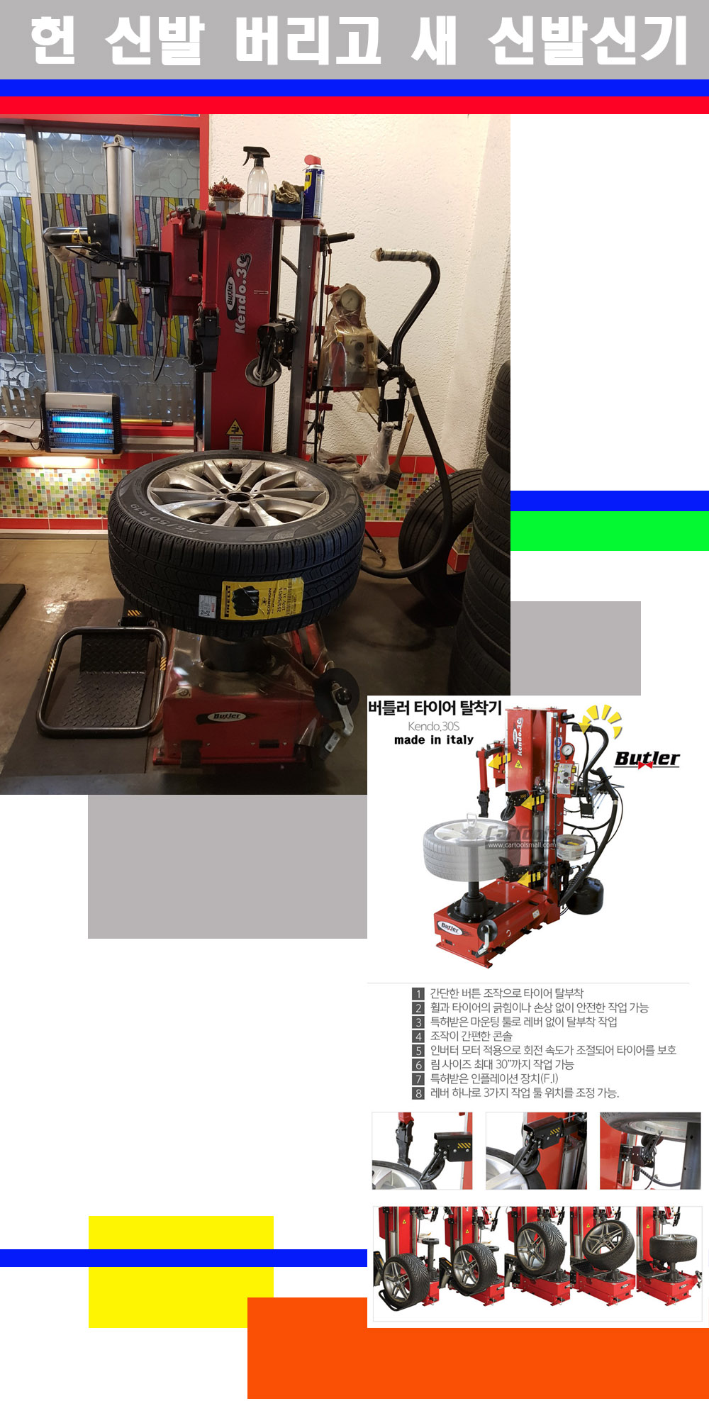 이태리 버틀러사의 켄도3.0S는 휠과 타이어와 조립과 분리시 전혀 제품에 손상을 주지않는 탈착기로 특히 센터락방식(중앙에서 휠를 고정하는 방식)이여서 휠의 중앙부위 잡아서 타이어를 탈부착하고 이후 상하롤러로 타이어를 탈부착합니다 특히 유니포미티작업(휠의 가장가벼운부분과 타이어의 가장 무거운부분을 매칭시키는 작업)시 작업자가 타이어를 정확한 지점에 휠과 매칭시킬수 있는 장점도 있습니다 유니포미티작업 불량시 과도한 진동값으로 핸들링불안 승차감저하 과도한 노면의 충격흡수를 가져와 주행감성을 해치는 첫번째 이유입니다 하지만 이런 작업을 무시하고 그냥 정적인 휠발란스작업만 하는것이 현실입니다 보통 타이어가격만 생각하시고 장착을 하시는데 꼭 이런 부분까지 챙길수 있는 샵을 권장합니다
