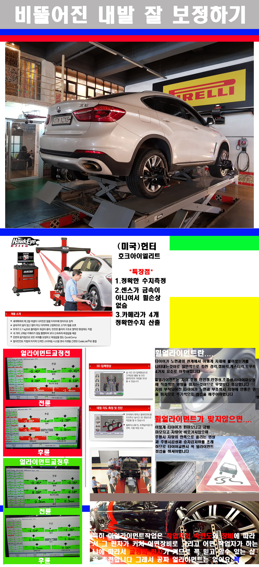 이후 미국 헌터사 호크아이엘리트 장비로 3D얼라이먼트를 진행했습니다 이장비는 현존하는 가장 진화된 얼라이먼트장비입니다 특히 4개의 고성능카메라가 장착되어져 있어 실시간으로 오차가 없는 측정값을 구현하며 바퀴당 각 휠센서 클램프가 프라스틱이며 타이어바닦면을 지지하는 방식이여서 휠의 손상이 없는것이 특징입니다 하지만 장비보다 차량의 얼라이먼트를 볼시 작업자의 정성과 그리고 능력과 숙련도가 관견이기에 꼭 휠얼라이먼트를 장사수단으로 하지않는 샵을 권장합니다 자사는 얼라이먼트정렬시 교정전 교정후를 구분하여 고객님께 직접 이수치값을 확인시켜드리고 작업을 하며 이후 각각의 특성을 가진 타이어들에 대해서 설명 및 관리요령 운전요령 같이 설명해드리고 있습니다 이후 타이어와 휠의 정확한 발란스값과 진동값을 보정후 헌터사 호크아이엘리트 3D얼라이먼트장비로 공장에서 처음 출고될시의 팩토리값으로 교정하였습니다 그리고 타이어질소가스주입기로 3번정도 진공상태로 만든후 질소가스를 주입했습니다 질소가스주입시 가장 관견은 순도이기에 이런 여러번의 진공상태후 주입하고 빼주는 과정를 많이 해주어야합니다 질소가스의 주입시 타이어공기압의 저하가 덜하고 화합물질이 반응을 하지않아 소음전파력과 그리고 타이어안쪽에 수분을 발생하지않으며 타이어안쪽에서의 공기압이 팽창하지않아 타이어에 스트레스를 덜주게 됩니다 하지만 이부분도 공기속에 질소가 80%정도 존재하기에 미미한 차이이지만 질소순도를 높이고 주행시 좋은 점이 확연히 많기에 질소주입을 해드리고 있습니다 특히 고성능타이어나 하중값을 많이 주는 타이어일경우에는 위에서 언급한 부분에서 많이 차이를 보이고 있습니다 이후 타이어왁싱후 출고했습니다+ 감사합니다 |