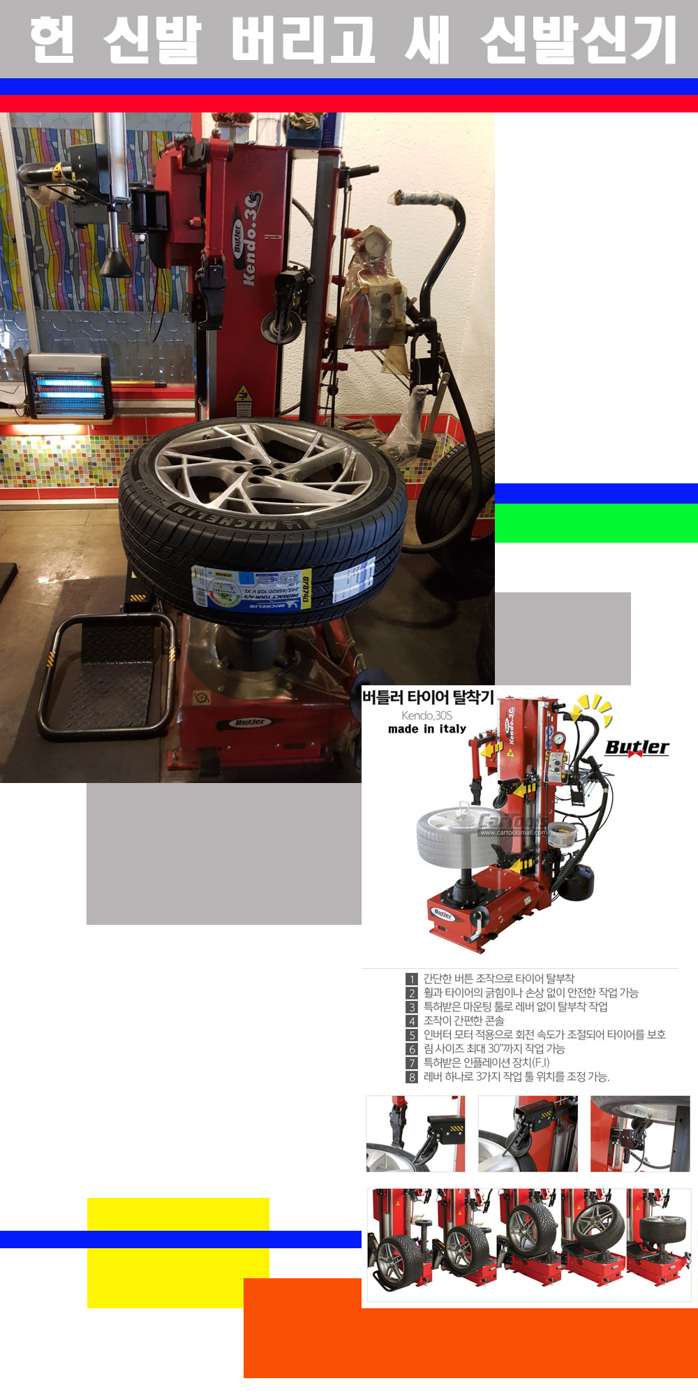 이태리 버틀러사의 켄도3.0S는 휠과 타이어와 조립과 분리시 전혀 제품에 손상을 주지않는 탈착기로 특히 센터락방식(중앙에서 휠를 고정하는 방식)이여서 휠의 중앙부위 잡아서 타이어를 탈부착하고 이후 상하롤러로 타이어를 탈부착합니다 특히 유니포미티작업(휠의 가장가벼운부분과 타이어의 가장 무거운부분을 매칭시키는 작업)시 작업자가 타이어를 정확한 지점에 휠과 매칭시킬수 있는 장점도 있습니다 유니포미티작업 불량시 과도한 진동값으로 핸들링불안 승차감저하 과도한 노면의 충격흡수를 가져와 주행감성을 해치는 첫번째 이유입니다 하지만 이런 작업을 무시하고 그냥 정적인 휠발란스작업만 하는것이 현실입니다 보통 타이어가격만 생각하시고 장착을 하시는데 꼭 이런 부분까지 챙길수 있는 샵을 권장합니다
