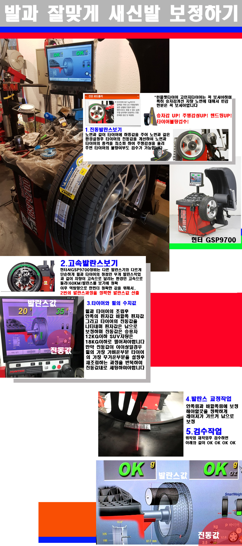 이후 미국 헌터사 GSP9700장비로 고속 및 진동발란스로 더욱더 작업의 정확도와 정밀도를 높였습니다 이장비는 노면에서 올라오는 진동값까지 계산하여 발란스값을 보는 방식으로 진동발란스기는 헌터사GSP9700장비가 유일합니다 이후 역방향으로 60키로의 고속으로 다시 발란스값을 보정하는 방식입니다 그래서 노면에서 올라오는 진동를 잡을수 있으며 특히 타이어의 노면력 측정으로 타이어의 불량여부까지도 검수가 가능한 장비입니다 특히 고속발란스 측정시 타사 발란스기와 틀리게 고속으로 발란스를 보기에 차량이 고속으로 달리는 시뮤레이션 구현이 가능하여 정확한 발란스값을 볼수가 있습니다 그리고 작업자에게는 불필요한 발란스납을 붙이지 않아 미관상으로 좋고 납을 절약하는 고객님에게도윈이고 작업자에게도 윈윈할수 있는 장비입니다 그리고 시중에서 고속진동발란스라고 말하시는 샵들이 많은데 꼭아셔야하는것은 고속발란스는 말그대로 발란스를 볼때 고속으로 돌리기에 60키로 전후 그리고 진동값을 계산하기위해서는 발란스기에 진동롤러가 있어야합니다 그래서 미국헌터사 GSP9700장비가 유일합니다