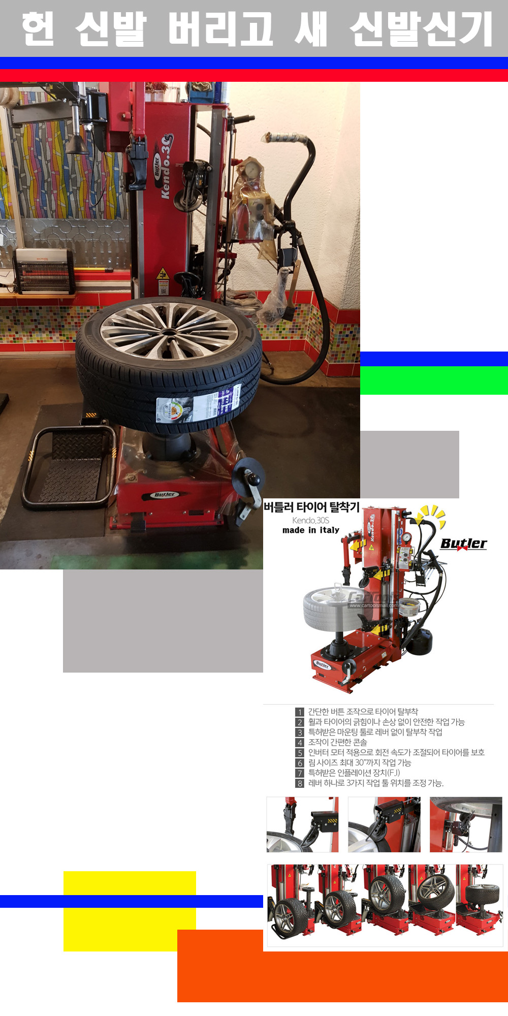 이태리 버틀러사의 켄도3.0S는 휠과 타이어와 조립과 분리시 전혀 제품에 손상을 주지않는 탈착기로 특히 센터락방식(중앙에서 휠를 고정하는 방식)이여서 휠의 중앙부위 잡아서 타이어를 탈부착하고 이후 상하롤러로 타이어를 탈부착합니다 특히 유니포미티작업(휠의 가장가벼운부분과 타이어의 가장 무거운부분을 매칭시키는 작업)시 작업자가 타이어를 정확한 지점에 휠과 매칭시킬수 있는 장점도 있습니다 유니포미티작업 불량시 과도한 진동값으로 핸들링불안 승차감저하 과도한 노면의 충격흡수를 가져와 주행감성을 해치는 첫번째 이유입니다 하지만 이런 작업을 무시하고 그냥 정적인 휠발란스작업만 하는것이 현실입니다 보통 타이어가격만 생각하시고 장착을 하시는데 꼭 이런 부분까지 챙길수 있는 샵을 권장합니다