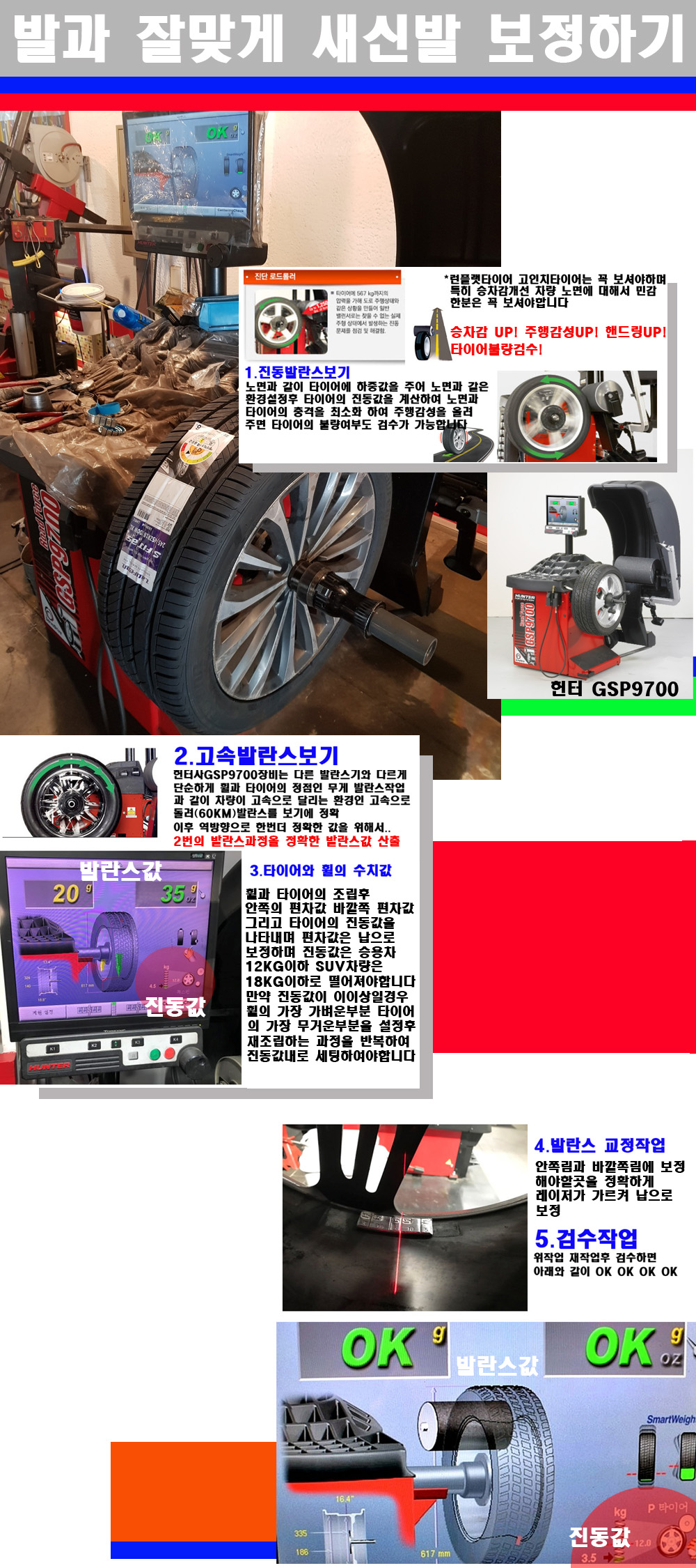 이후 미국 헌터사 GSP9700장비로 고속 및 진동발란스로 더욱더 작업의 정확도와 정밀도를 높였습니다 이장비는 노면에서 올라오는 진동값까지 계산하여 발란스값을 보는 방식으로 진동발란스기는 헌터사GSP9700장비가 유일합니다 이후 역방향으로 60키로의 고속으로 다시 발란스값을 보정하는 방식입니다 그래서 노면에서 올라오는 진동를 잡을수 있으며 특히 타이어의 노면력 측정으로 타이어의 불량여부까지도 검수가 가능한 장비입니다 특히 고속발란스 측정시 타사 발란스기와 틀리게 고속으로 발란스를 보기에 차량이 고속으로 달리는 시뮤레이션 구현이 가능하여 정확한 발란스값을 볼수가 있습니다 그리고 작업자에게는 불필요한 발란스납을 붙이지 않아 미관상으로 좋고 납을 절약하는 고객님에게도윈이고 작업자에게도 윈윈할수 있는 장비입니다 그리고 시중에서 고속진동발란스라고 말하시는 샵들이 많은데 꼭아셔야하는것은 고속발란스는 말그대로 발란스를 볼때 고속으로 돌리기에 60키로 전후 그리고 진동값을 계산하기위해서는 발란스기에 진동롤러가 있어야합니다 그래서 미국헌터사 GSP9700장비가 유일합니다