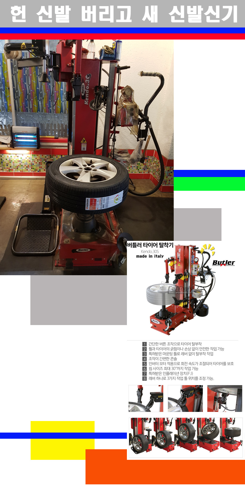 이태리 버틀러사의 켄도3.0S는 휠과 타이어와 조립과 분리시 전혀 제품에 손상을 주지않는 탈착기로 특히 센터락방식(중앙에서 휠를 고정하는 방식)이여서 휠의 중앙부위 잡아서 타이어를 탈부착하고 이후 상하롤러로 타이어를 탈부착합니다 특히 유니포미티작업(휠의 가장가벼운부분과 타이어의 가장 무거운부분을 매칭시키는 작업)시 작업자가 타이어를 정확한 지점에 휠과 매칭시킬수 있는 장점도 있습니다 유니포미티작업 불량시 과도한 진동값으로 핸들링불안 승차감저하 과도한 노면의 충격흡수를 가져와 주행감성을 해치는 첫번째 이유입니다 하지만 이런 작업을 무시하고 그냥 정적인 휠발란스작업만 하는것이 현실입니다 보통 타이어가격만 생각하시고 장착을 하시는데 꼭 이런 부분까지 챙길수 있는 샵을 권장합니다