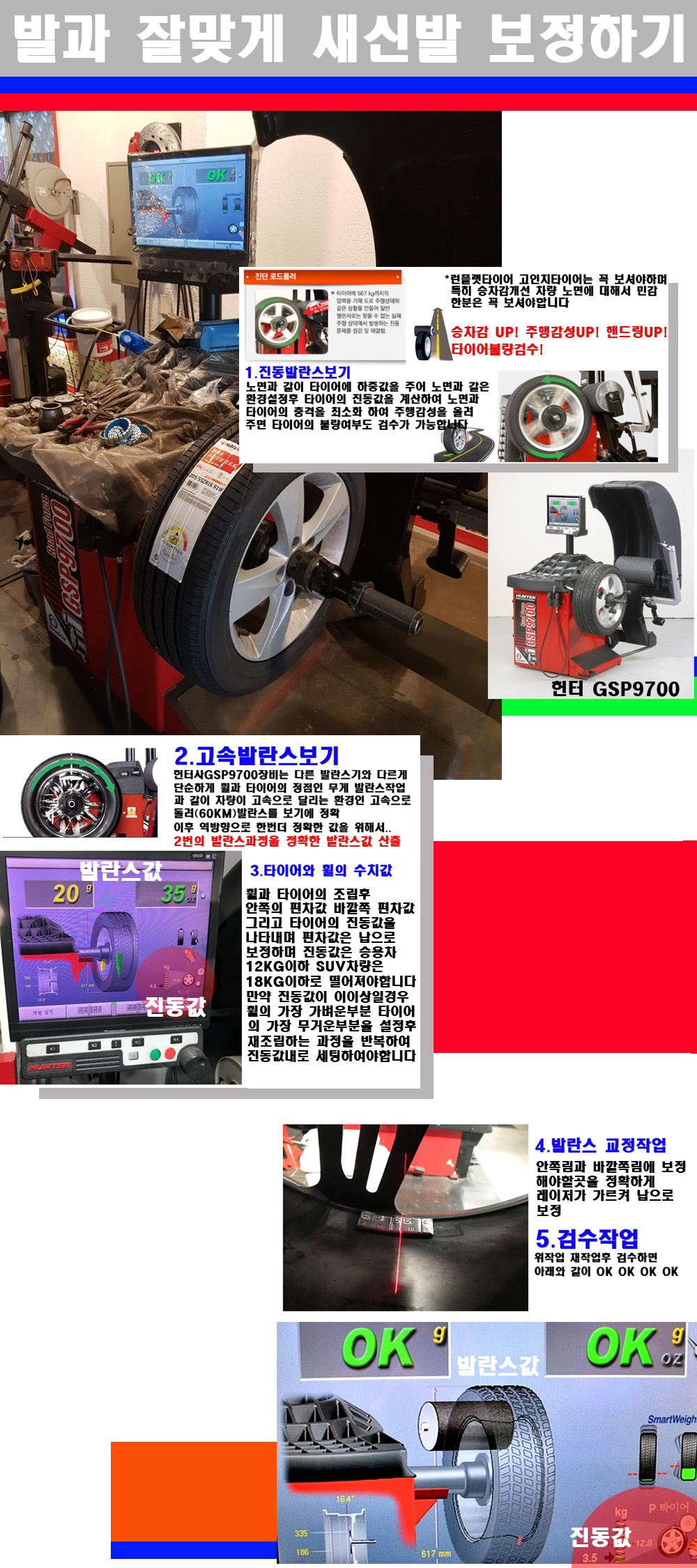 이후 미국 헌터사 GSP9700장비로 고속 및 진동발란스로 더욱더 작업의 정확도와 정밀도를 높였습니다 이장비는 노면에서 올라오는 진동값까지 계산하여 발란스값을 보는 방식으로 진동발란스기는 헌터사GSP9700장비가 유일합니다 이후 역방향으로 60키로의 고속으로 다시 발란스값을 보정하는 방식입니다 그래서 노면에서 올라오는 진동를 잡을수 있으며 특히 타이어의 노면력 측정으로 타이어의 불량여부까지도 검수가 가능한 장비입니다 특히 고속발란스 측정시 타사 발란스기와 틀리게 고속으로 발란스를 보기에 차량이 고속으로 달리는 시뮤레이션 구현이 가능하여 정확한 발란스값을 볼수가 있습니다 그리고 작업자에게는 불필요한 발란스납을 붙이지 않아 미관상으로 좋고 납을 절약하는 고객님에게도윈이고 작업자에게도 윈윈할수 있는 장비입니다 그리고 시중에서 고속진동발란스라고 말하시는 샵들이 많은데 꼭아셔야하는것은 고속발란스는 말그대로 발란스를 볼때 고속으로 돌리기에 60키로 전후 그리고 진동값을 계산하기위해서는 발란스기에 진동롤러가 있어야합니다 그래서 미국헌터사 GSP9700장비가 유일합니다