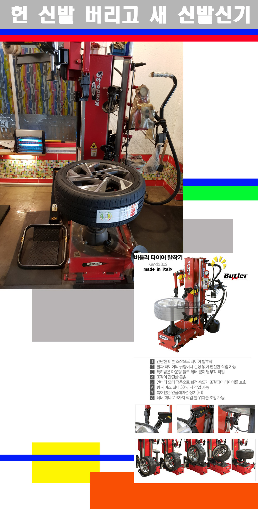 이태리 버틀러사의 켄도3.0S는 휠과 타이어와 조립과 분리시 전혀 제품에 손상을 주지않는 탈착기로 특히 센터락방식(중앙에서 휠를 고정하는 방식)이여서 휠의 중앙부위 잡아서 타이어를 탈부착하고 이후 상하롤러로 타이어를 탈부착합니다 특히 유니포미티작업(휠의 가장가벼운부분과 타이어의 가장 무거운부분을 매칭시키는 작업)시 작업자가 타이어를 정확한 지점에 휠과 매칭시킬수 있는 장점도 있습니다 유니포미티작업 불량시 과도한 진동값으로 핸들링불안 승차감저하 과도한 노면의 충격흡수를 가져와 주행감성을 해치는 첫번째 이유입니다 하지만 이런 작업을 무시하고 그냥 정적인 휠발란스작업만 하는것이 현실입니다 보통 타이어가격만 생각하시고 장착을 하시는데 꼭 이런 부분까지 챙길수 있는 샵을 권장합니다