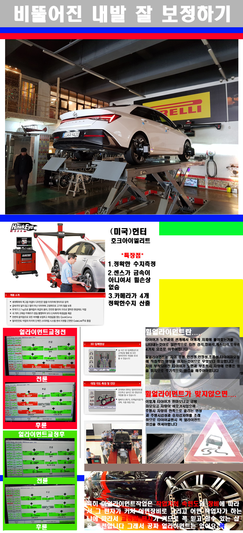 이후 미국 헌터사 호크아이엘리트 장비로 3D얼라이먼트를 진행했습니다 이장비는 현존하는 가장 진화된 얼라이먼트장비입니다 특히 4개의 고성능카메라가 장착되어져 있어 실시간으로 오차가 없는 측정값을 구현하며 바퀴당 각 휠센서 클램프가 프라스틱이며 타이어바닦면을 지지하는 방식이여서 휠의 손상이 없는것이 특징입니다 하지만 장비보다 차량의 얼라이먼트를 볼시 작업자의 정성과 그리고 능력과 숙련도가 관견이기에 꼭 휠얼라이먼트를 장사수단으로 하지않는 샵을 권장합니다 자사는 얼라이먼트정렬시 교정전 교정후를 구분하여 고객님께 직접 이수치값을 확인시켜드리고 작업을 하며 이후 각각의 특성을 가진 타이어들에 대해서 설명 및 관리요령 운전요령 같이 설명해드리고 있습니다 이후 타이어와 휠의 정확한 발란스값과 진동값을 보정후 헌터사 호크아이엘리트 3D얼라이먼트장비로 공장에서 처음 출고될시의 팩토리값으로 교정하였습니다 그리고 타이어질소가스주입기로 3번정도 진공상태로 만든후 질소가스를 주입했습니다 질소가스주입시 가장 관견은 순도이기에 이런 여러번의 진공상태후 주입하고 빼주는 과정를 많이 해주어야합니다 질소가스의 주입시 타이어공기압의 저하가 덜하고 화합물질이 반응을 하지않아 소음전파력과 그리고 타이어안쪽에 수분을 발생하지않으며 타이어안쪽에서의 공기압이 팽창하지않아 타이어에 스트레스를 덜주게 됩니다 하지만 이부분도 공기속에 질소가 80%정도 존재하기에 미미한 차이이지만 질소순도를 높이고 주행시 좋은 점이 확연히 많기에 질소주입을 해드리고 있습니다 특히 고성능타이어나 하중값을 많이 주는 타이어일경우에는 위에서 언급한 부분에서 많이 차이를 보이고 있습니다 이후 타이어왁싱후 출고했습니다+ 감사합니다 |