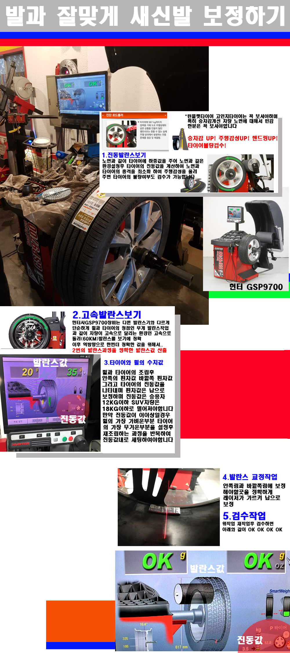 이후 미국 헌터사 GSP9700장비로 고속 및 진동발란스로 더욱더 작업의 정확도와 정밀도를 높였습니다 이장비는 노면에서 올라오는 진동값까지 계산하여 발란스값을 보는 방식으로 진동발란스기는 헌터사GSP9700장비가 유일합니다 이후 역방향으로 60키로의 고속으로 다시 발란스값을 보정하는 방식입니다 그래서 노면에서 올라오는 진동를 잡을수 있으며 특히 타이어의 노면력 측정으로 타이어의 불량여부까지도 검수가 가능한 장비입니다 특히 고속발란스 측정시 타사 발란스기와 틀리게 고속으로 발란스를 보기에 차량이 고속으로 달리는 시뮤레이션 구현이 가능하여 정확한 발란스값을 볼수가 있습니다 그리고 작업자에게는 불필요한 발란스납을 붙이지 않아 미관상으로 좋고 납을 절약하는 고객님에게도윈이고 작업자에게도 윈윈할수 있는 장비입니다 그리고 시중에서 고속진동발란스라고 말하시는 샵들이 많은데 꼭아셔야하는것은 고속발란스는 말그대로 발란스를 볼때 고속으로 돌리기에 60키로 전후 그리고 진동값을 계산하기위해서는 발란스기에 진동롤러가 있어야합니다 그래서 미국헌터사 GSP9700장비가 유일합니다