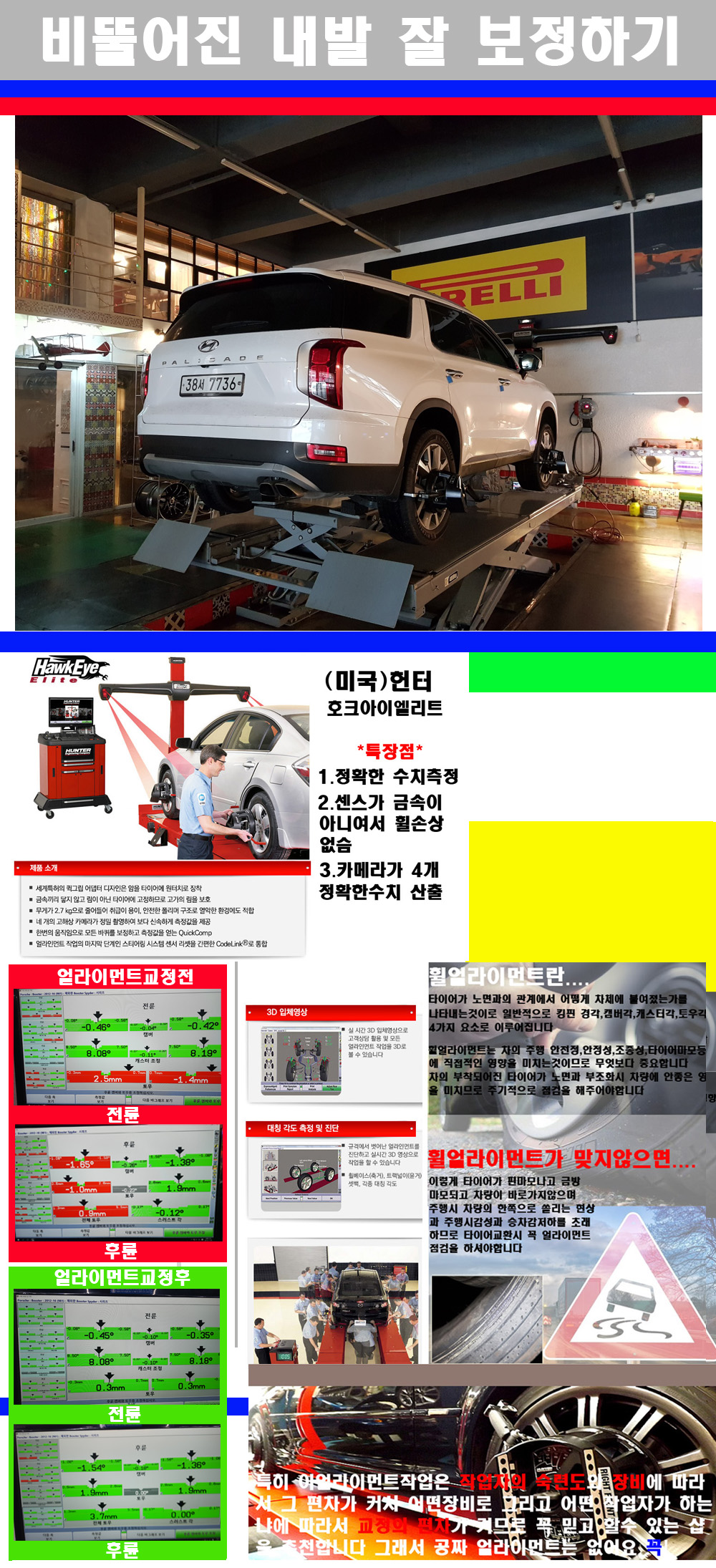 이후 미국 헌터사 호크아이엘리트 장비로 3D얼라이먼트를 진행했습니다 이장비는 현존하는 가장 진화된 얼라이먼트장비입니다 특히 4개의 고성능카메라가 장착되어져 있어 실시간으로 오차가 없는 측정값을 구현하며 바퀴당 각 휠센서 클램프가 프라스틱이며 타이어바닦면을 지지하는 방식이여서 휠의 손상이 없는것이 특징입니다 하지만 장비보다 차량의 얼라이먼트를 볼시 작업자의 정성과 그리고 능력과 숙련도가 관견이기에 꼭 휠얼라이먼트를 장사수단으로 하지않는 샵을 권장합니다 자사는 얼라이먼트정렬시 교정전 교정후를 구분하여 고객님께 직접 이수치값을 확인시켜드리고 작업을 하며 이후 각각의 특성을 가진 타이어들에 대해서 설명 및 관리요령 운전요령 같이 설명해드리고 있습니다 이후 타이어와 휠의 정확한 발란스값과 진동값을 보정후 헌터사 호크아이엘리트 3D얼라이먼트장비로 공장에서 처음 출고될시의 팩토리값으로 교정하였습니다 그리고 타이어질소가스주입기로 3번정도 진공상태로 만든후 질소가스를 주입했습니다 질소가스주입시 가장 관견은 순도이기에 이런 여러번의 진공상태후 주입하고 빼주는 과정를 많이 해주어야합니다 질소가스의 주입시 타이어공기압의 저하가 덜하고 화합물질이 반응을 하지않아 소음전파력과 그리고 타이어안쪽에 수분을 발생하지않으며 타이어안쪽에서의 공기압이 팽창하지않아 타이어에 스트레스를 덜주게 됩니다 하지만 이부분도 공기속에 질소가 80%정도 존재하기에 미미한 차이이지만 질소순도를 높이고 주행시 좋은 점이 확연히 많기에 질소주입을 해드리고 있습니다 특히 고성능타이어나 하중값을 많이 주는 타이어일경우에는 위에서 언급한 부분에서 많이 차이를 보이고 있습니다 이후 타이어왁싱후 출고했습니다+ 감사합니다 |