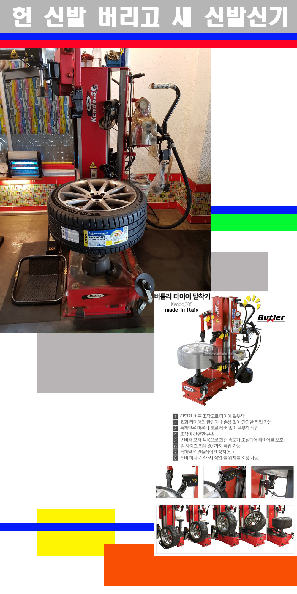 이태리 버틀러사의 켄도3.0S는 휠과 타이어와 조립과 분리시 전혀 제품에 손상을 주지않는 탈착기로 특히 센터락방식(중앙에서 휠를 고정하는 방식)이여서 휠의 중앙부위 잡아서 타이어를 탈부착하고 이후 상하롤러로 타이어를 탈부착합니다 특히 유니포미티작업(휠의 가장가벼운부분과 타이어의 가장 무거운부분을 매칭시키는 작업)시 작업자가 타이어를 정확한 지점에 휠과 매칭시킬수 있는 장점도 있습니다 유니포미티작업 불량시 과도한 진동값으로 핸들링불안 승차감저하 과도한 노면의 충격흡수를 가져와 주행감성을 해치는 첫번째 이유입니다 하지만 이런 작업을 무시하고 그냥 정적인 휠발란스작업만 하는것이 현실입니다 보통 타이어가격만 생각하시고 장착을 하시는데 꼭 이런 부분까지 챙길수 있는 샵을 권장합니다