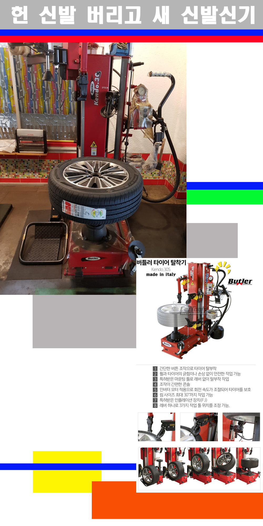 이태리 버틀러사의 켄도3.0S는 휠과 타이어와 조립과 분리시 전혀 제품에 손상을 주지않는 탈착기로 특히 센터락방식(중앙에서 휠를 고정하는 방식)이여서 휠의 중앙부위 잡아서 타이어를 탈부착하고 이후 상하롤러로 타이어를 탈부착합니다 특히 유니포미티작업(휠의 가장가벼운부분과 타이어의 가장 무거운부분을 매칭시키는 작업)시 작업자가 타이어를 정확한 지점에 휠과 매칭시킬수 있는 장점도 있습니다 유니포미티작업 불량시 과도한 진동값으로 핸들링불안 승차감저하 과도한 노면의 충격흡수를 가져와 주행감성을 해치는 첫번째 이유입니다 하지만 이런 작업을 무시하고 그냥 정적인 휠발란스작업만 하는것이 현실입니다 보통 타이어가격만 생각하시고 장착을 하시는데 꼭 이런 부분까지 챙길수 있는 샵을 권장합니다