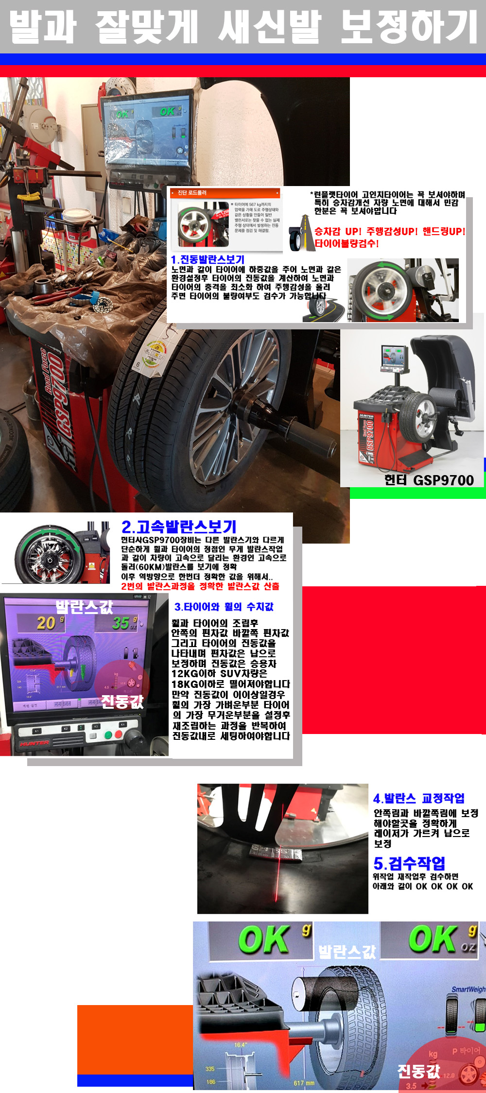 이후 미국 헌터사 GSP9700장비로 고속 및 진동발란스로 더욱더 작업의 정확도와 정밀도를 높였습니다 이장비는 노면에서 올라오는 진동값까지 계산하여 발란스값을 보는 방식으로 진동발란스기는 헌터사GSP9700장비가 유일합니다 이후 역방향으로 60키로의 고속으로 다시 발란스값을 보정하는 방식입니다 그래서 노면에서 올라오는 진동를 잡을수 있으며 특히 타이어의 노면력 측정으로 타이어의 불량여부까지도 검수가 가능한 장비입니다 특히 고속발란스 측정시 타사 발란스기와 틀리게 고속으로 발란스를 보기에 차량이 고속으로 달리는 시뮤레이션 구현이 가능하여 정확한 발란스값을 볼수가 있습니다 그리고 작업자에게는 불필요한 발란스납을 붙이지 않아 미관상으로 좋고 납을 절약하는 고객님에게도윈이고 작업자에게도 윈윈할수 있는 장비입니다 그리고 시중에서 고속진동발란스라고 말하시는 샵들이 많은데 꼭아셔야하는것은 고속발란스는 말그대로 발란스를 볼때 고속으로 돌리기에 60키로 전후 그리고 진동값을 계산하기위해서는 발란스기에 진동롤러가 있어야합니다 그래서 미국헌터사 GSP9700장비가 유일합니다