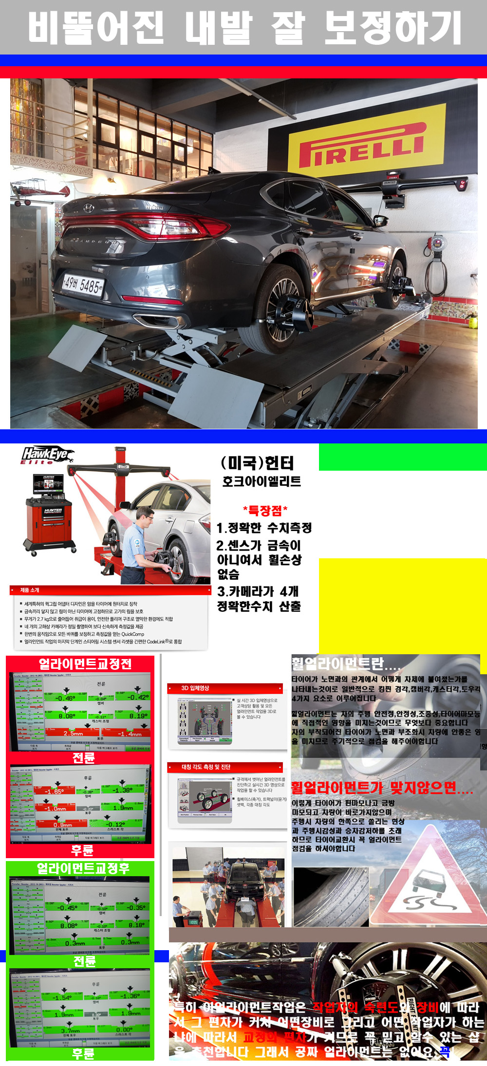 이후 미국 헌터사 호크아이엘리트 장비로 3D얼라이먼트를 진행했습니다 이장비는 현존하는 가장 진화된 얼라이먼트장비입니다 특히 4개의 고성능카메라가 장착되어져 있어 실시간으로 오차가 없는 측정값을 구현하며 바퀴당 각 휠센서 클램프가 프라스틱이며 타이어바닦면을 지지하는 방식이여서 휠의 손상이 없는것이 특징입니다 하지만 장비보다 차량의 얼라이먼트를 볼시 작업자의 정성과 그리고 능력과 숙련도가 관견이기에 꼭 휠얼라이먼트를 장사수단으로 하지않는 샵을 권장합니다 자사는 얼라이먼트정렬시 교정전 교정후를 구분하여 고객님께 직접 이수치값을 확인시켜드리고 작업을 하며 이후 각각의 특성을 가진 타이어들에 대해서 설명 및 관리요령 운전요령 같이 설명해드리고 있습니다 이후 타이어와 휠의 정확한 발란스값과 진동값을 보정후 헌터사 호크아이엘리트 3D얼라이먼트장비로 공장에서 처음 출고될시의 팩토리값으로 교정하였습니다 그리고 타이어질소가스주입기로 3번정도 진공상태로 만든후 질소가스를 주입했습니다 질소가스주입시 가장 관견은 순도이기에 이런 여러번의 진공상태후 주입하고 빼주는 과정를 많이 해주어야합니다 질소가스의 주입시 타이어공기압의 저하가 덜하고 화합물질이 반응을 하지않아 소음전파력과 그리고 타이어안쪽에 수분을 발생하지않으며 타이어안쪽에서의 공기압이 팽창하지않아 타이어에 스트레스를 덜주게 됩니다 하지만 이부분도 공기속에 질소가 80%정도 존재하기에 미미한 차이이지만 질소순도를 높이고 주행시 좋은 점이 확연히 많기에 질소주입을 해드리고 있습니다 특히 고성능타이어나 하중값을 많이 주는 타이어일경우에는 위에서 언급한 부분에서 많이 차이를 보이고 있습니다 이후 타이어왁싱후 출고했습니다+ 감사합니다 |