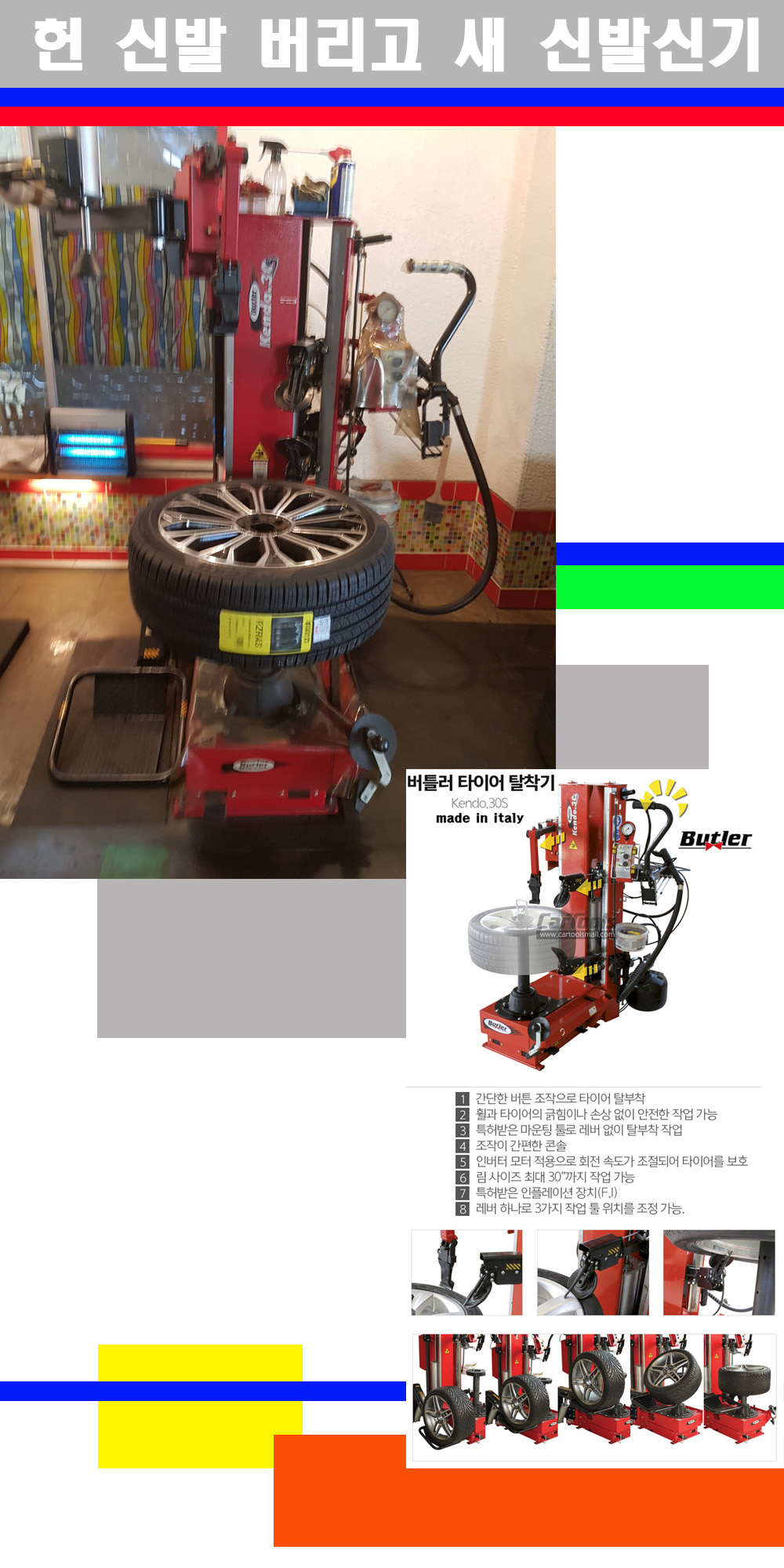 이태리 버틀러사의 켄도3.0S는 휠과 타이어와 조립과 분리시 전혀 제품에 손상을 주지않는 탈착기로 특히 센터락방식(중앙에서 휠를 고정하는 방식)이여서 휠의 중앙부위 잡아서 타이어를 탈부착하고 이후 상하롤러로 타이어를 탈부착합니다 특히 유니포미티작업(휠의 가장가벼운부분과 타이어의 가장 무거운부분을 매칭시키는 작업)시 작업자가 타이어를 정확한 지점에 휠과 매칭시킬수 있는 장점도 있습니다 유니포미티작업 불량시 과도한 진동값으로 핸들링불안 승차감저하 과도한 노면의 충격흡수를 가져와 주행감성을 해치는 첫번째 이유입니다 하지만 이런 작업을 무시하고 그냥 정적인 휠발란스작업만 하는것이 현실입니다 보통 타이어가격만 생각하시고 장착을 하시는데 꼭 이런 부분까지 챙길수 있는 샵을 권장합니다