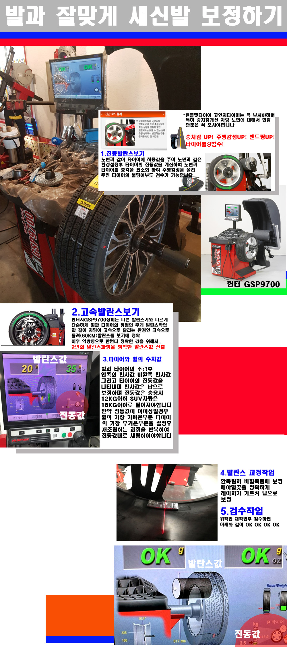 이후 미국 헌터사 GSP9700장비로 고속 및 진동발란스로 더욱더 작업의 정확도와 정밀도를 높였습니다 이장비는 노면에서 올라오는 진동값까지 계산하여 발란스값을 보는 방식으로 진동발란스기는 헌터사GSP9700장비가 유일합니다 이후 역방향으로 60키로의 고속으로 다시 발란스값을 보정하는 방식입니다 그래서 노면에서 올라오는 진동를 잡을수 있으며 특히 타이어의 노면력 측정으로 타이어의 불량여부까지도 검수가 가능한 장비입니다 특히 고속발란스 측정시 타사 발란스기와 틀리게 고속으로 발란스를 보기에 차량이 고속으로 달리는 시뮤레이션 구현이 가능하여 정확한 발란스값을 볼수가 있습니다 그리고 작업자에게는 불필요한 발란스납을 붙이지 않아 미관상으로 좋고 납을 절약하는 고객님에게도윈이고 작업자에게도 윈윈할수 있는 장비입니다 그리고 시중에서 고속진동발란스라고 말하시는 샵들이 많은데 꼭아셔야하는것은 고속발란스는 말그대로 발란스를 볼때 고속으로 돌리기에 60키로 전후 그리고 진동값을 계산하기위해서는 발란스기에 진동롤러가 있어야합니다 그래서 미국헌터사 GSP9700장비가 유일합니다